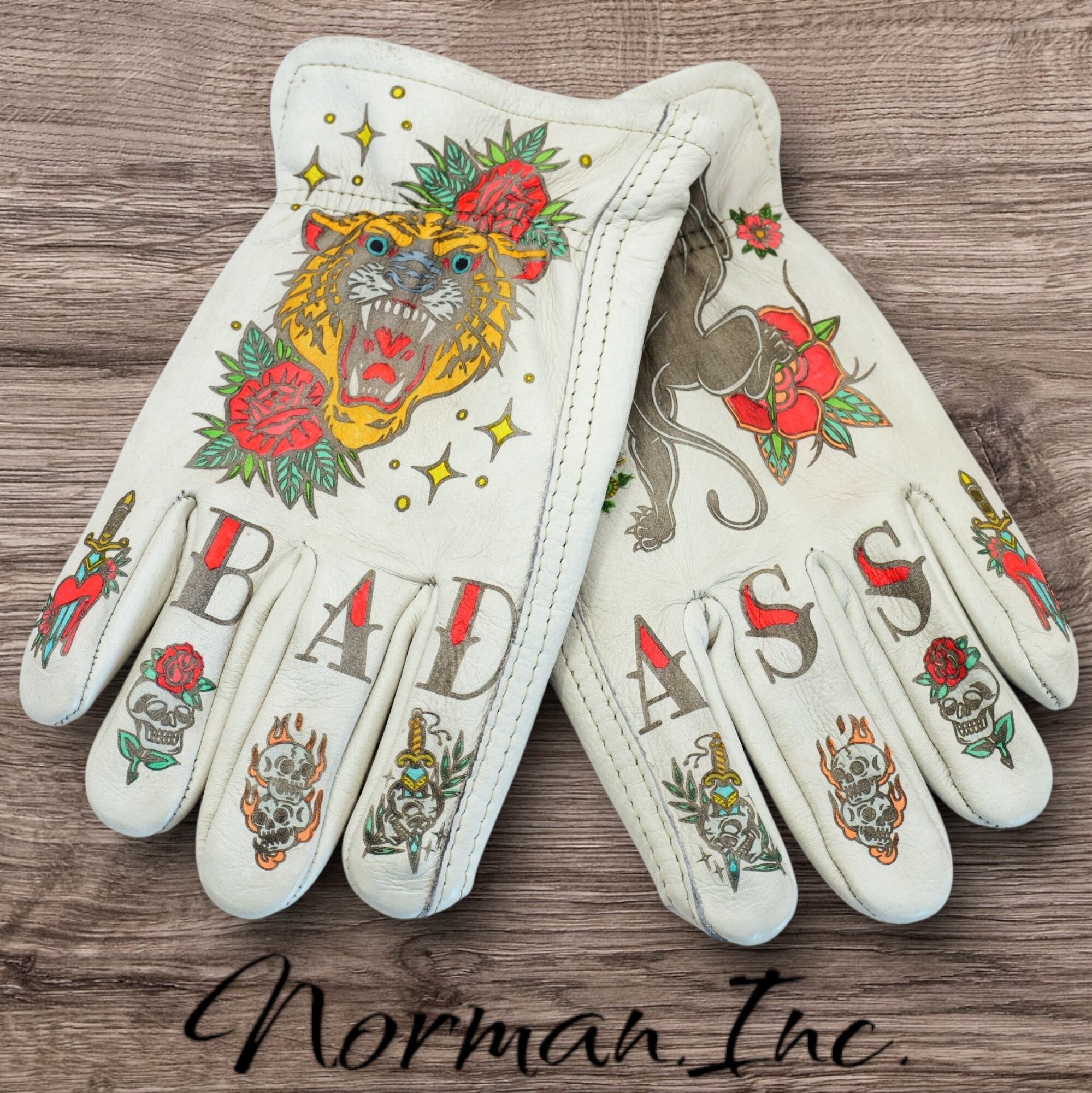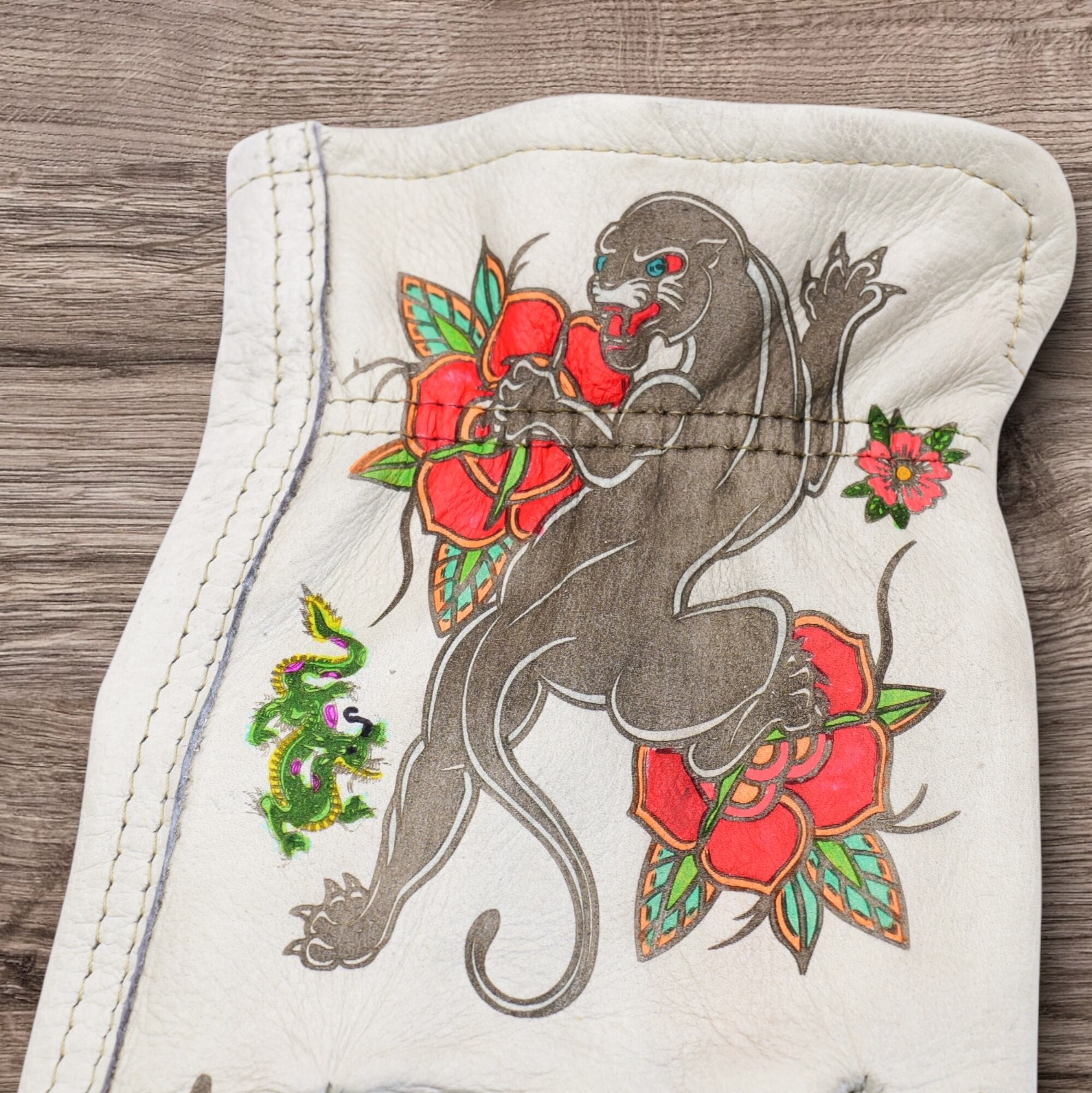 カラー入りトラディショナルタトゥーデザインを施した、ホワイトの牛革レザーグローブになります。