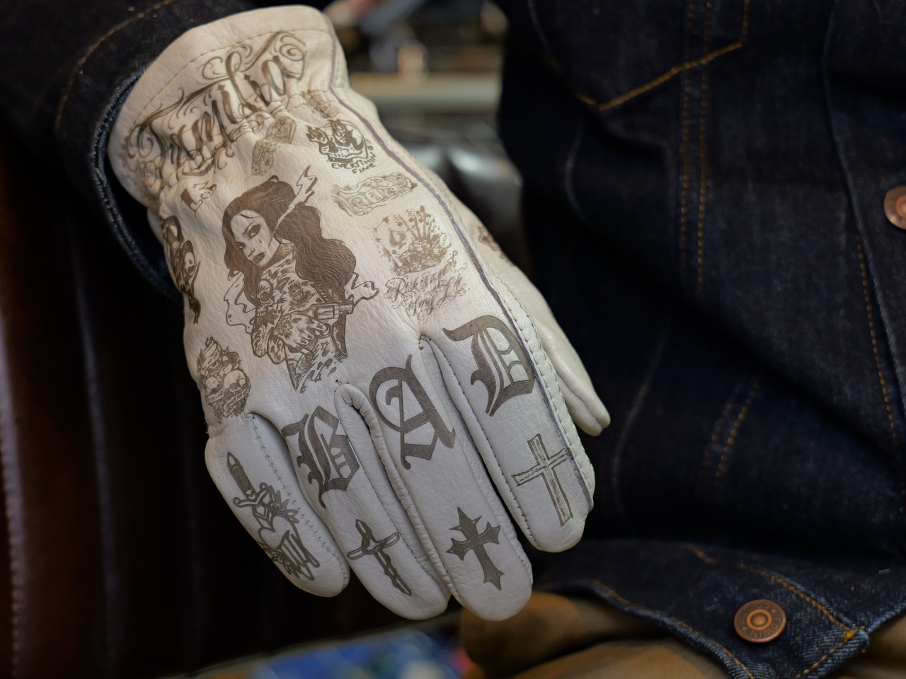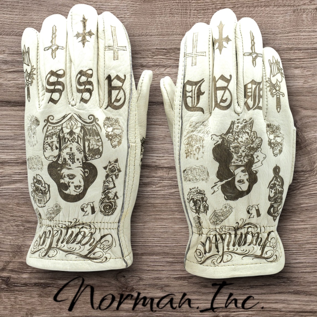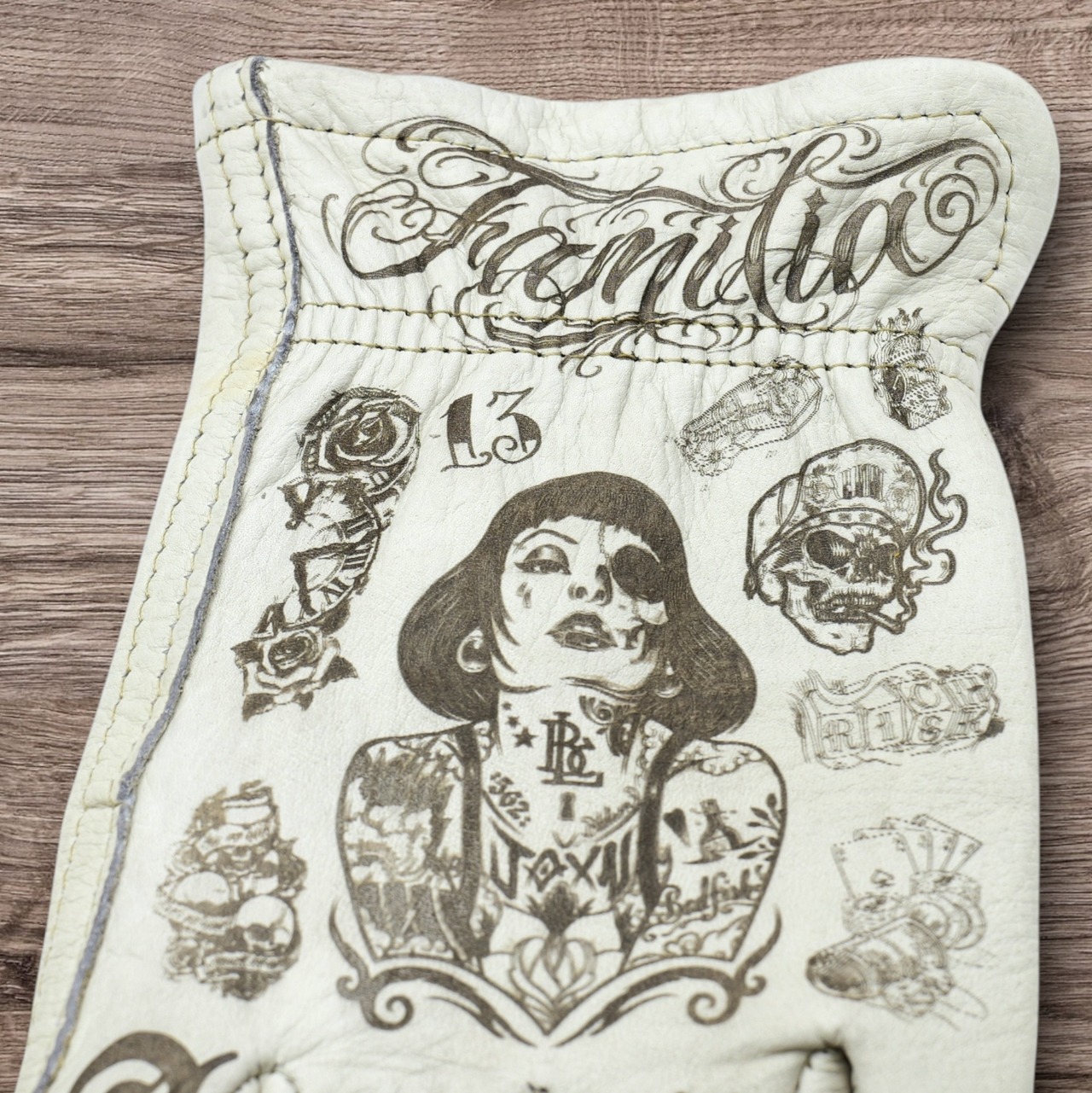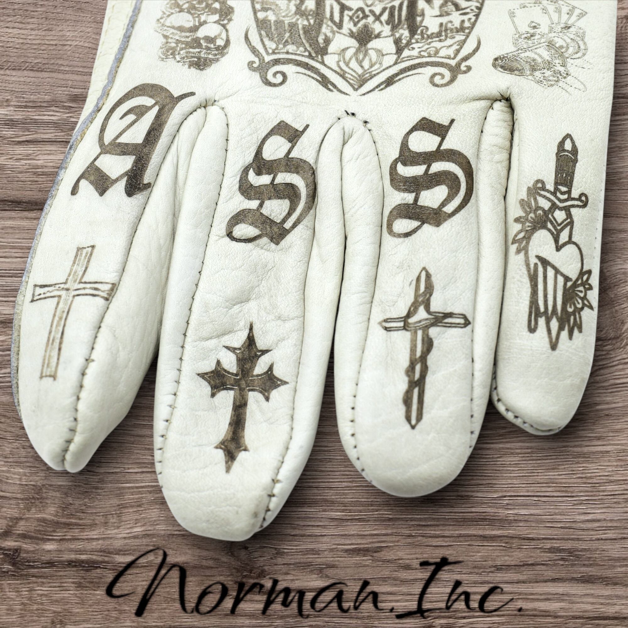 アメリカンタトゥーデザインを施した、ホワイトの牛革レザーグローブになります。