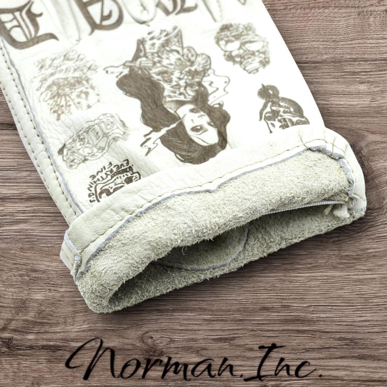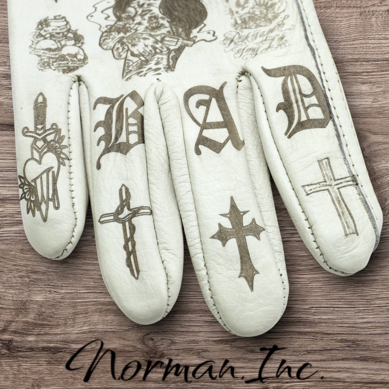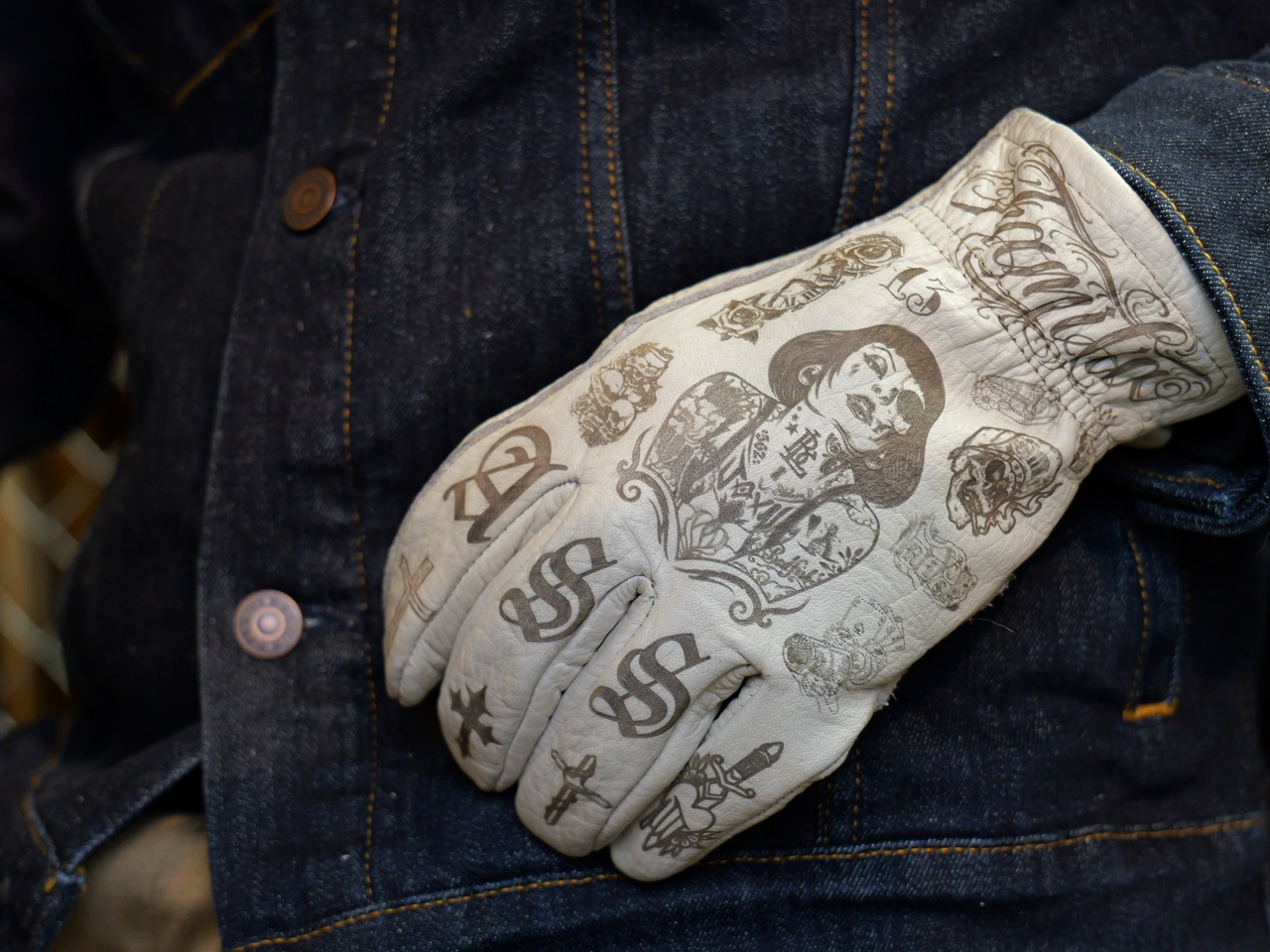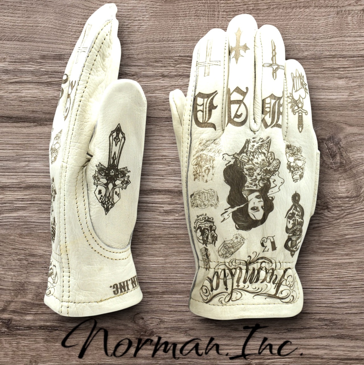 アメリカンタトゥーデザインを施した、ホワイトの牛革レザーグローブになります。