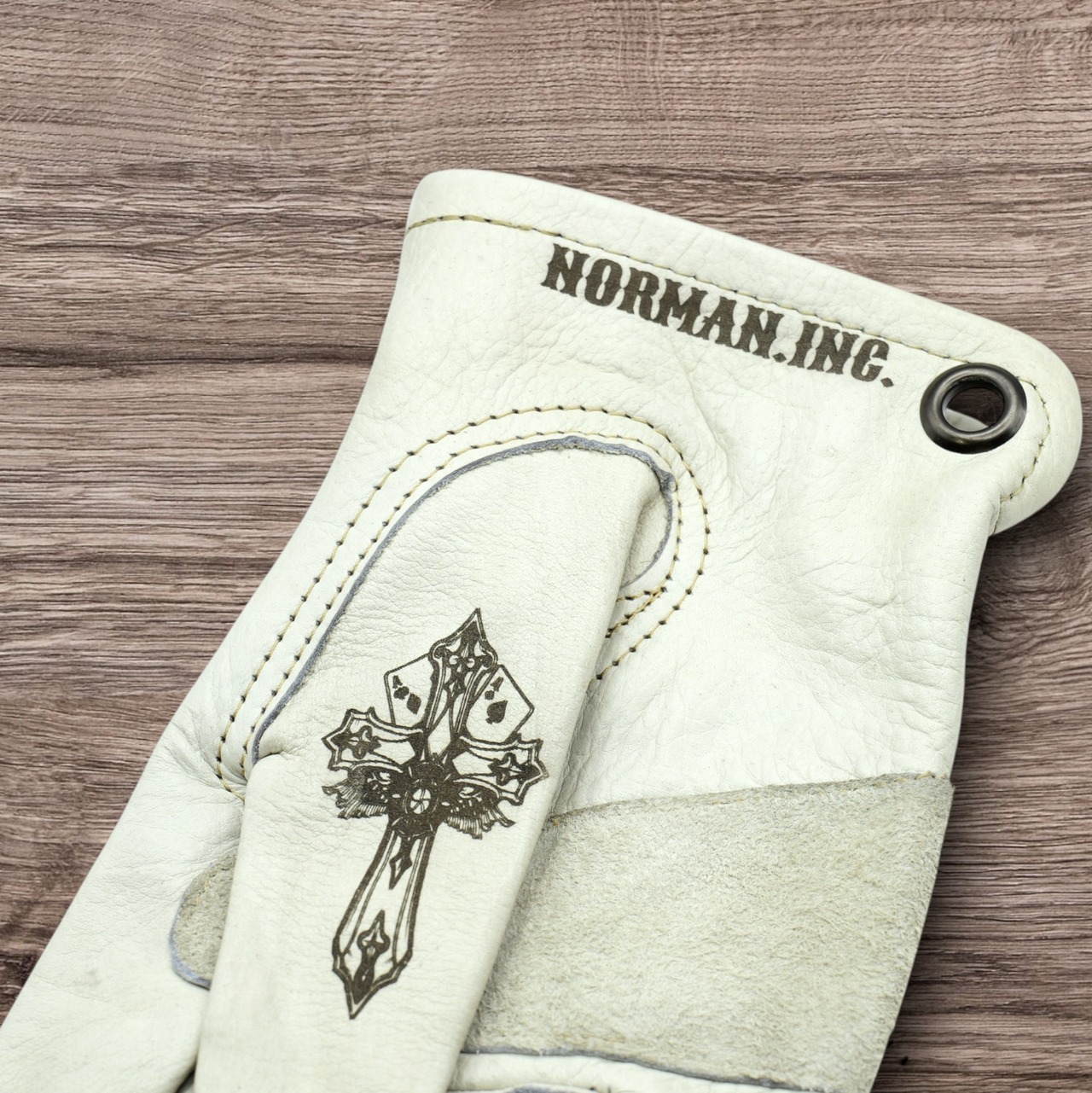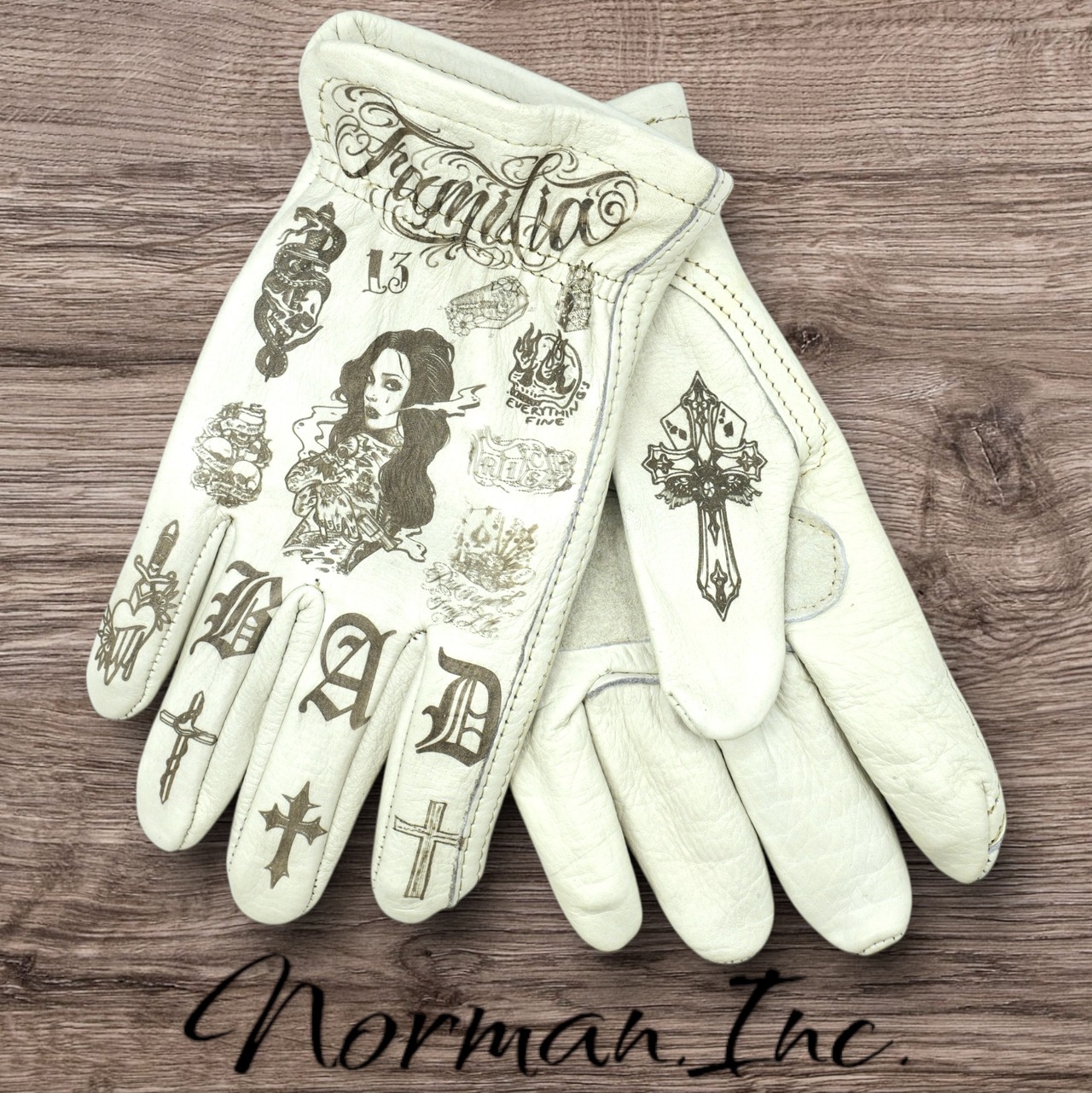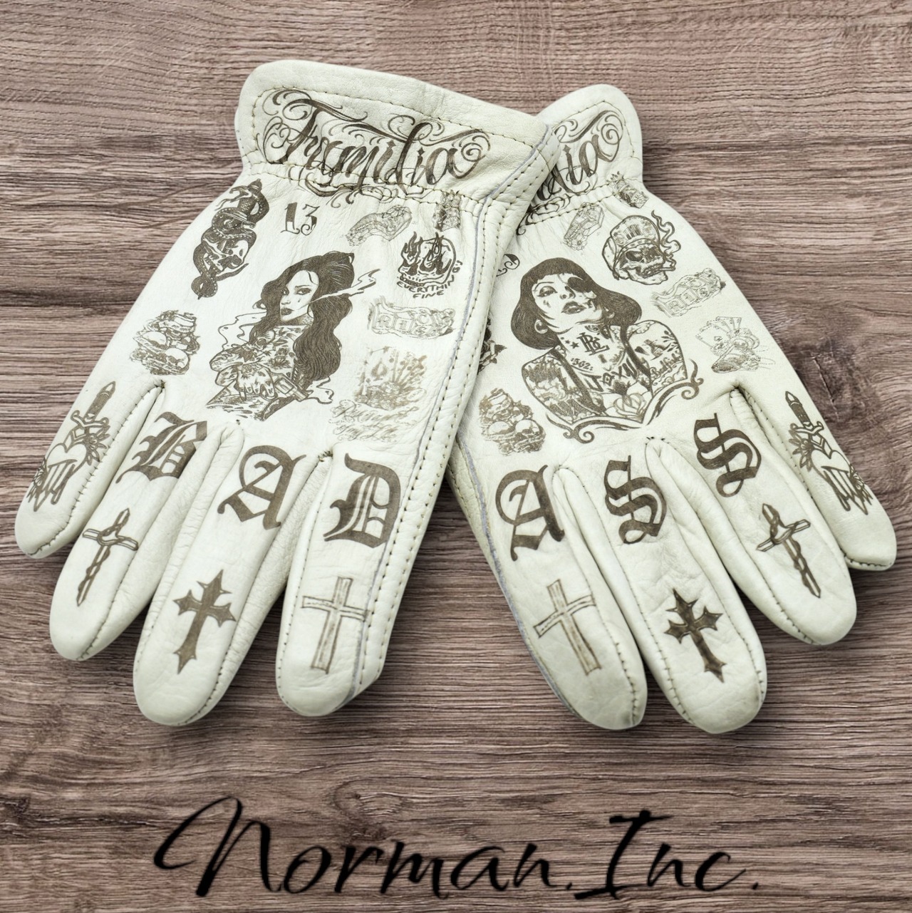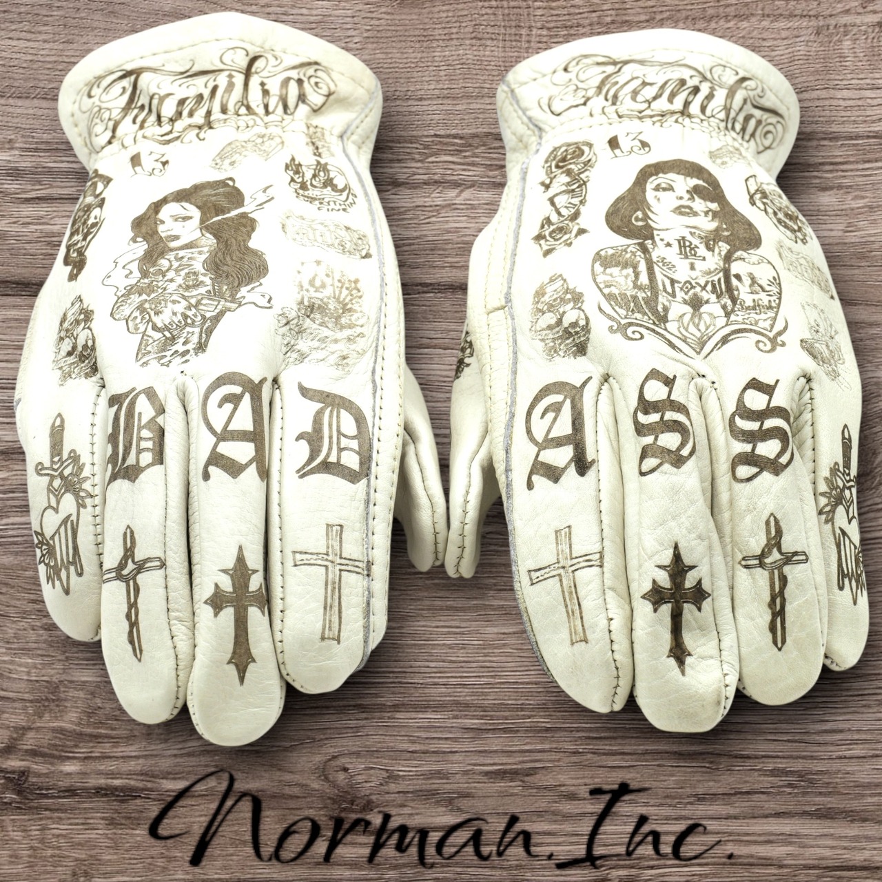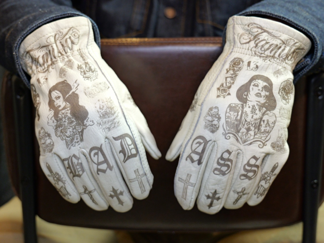 アメリカンタトゥーデザインを施した、ホワイトの牛革レザーグローブになります。