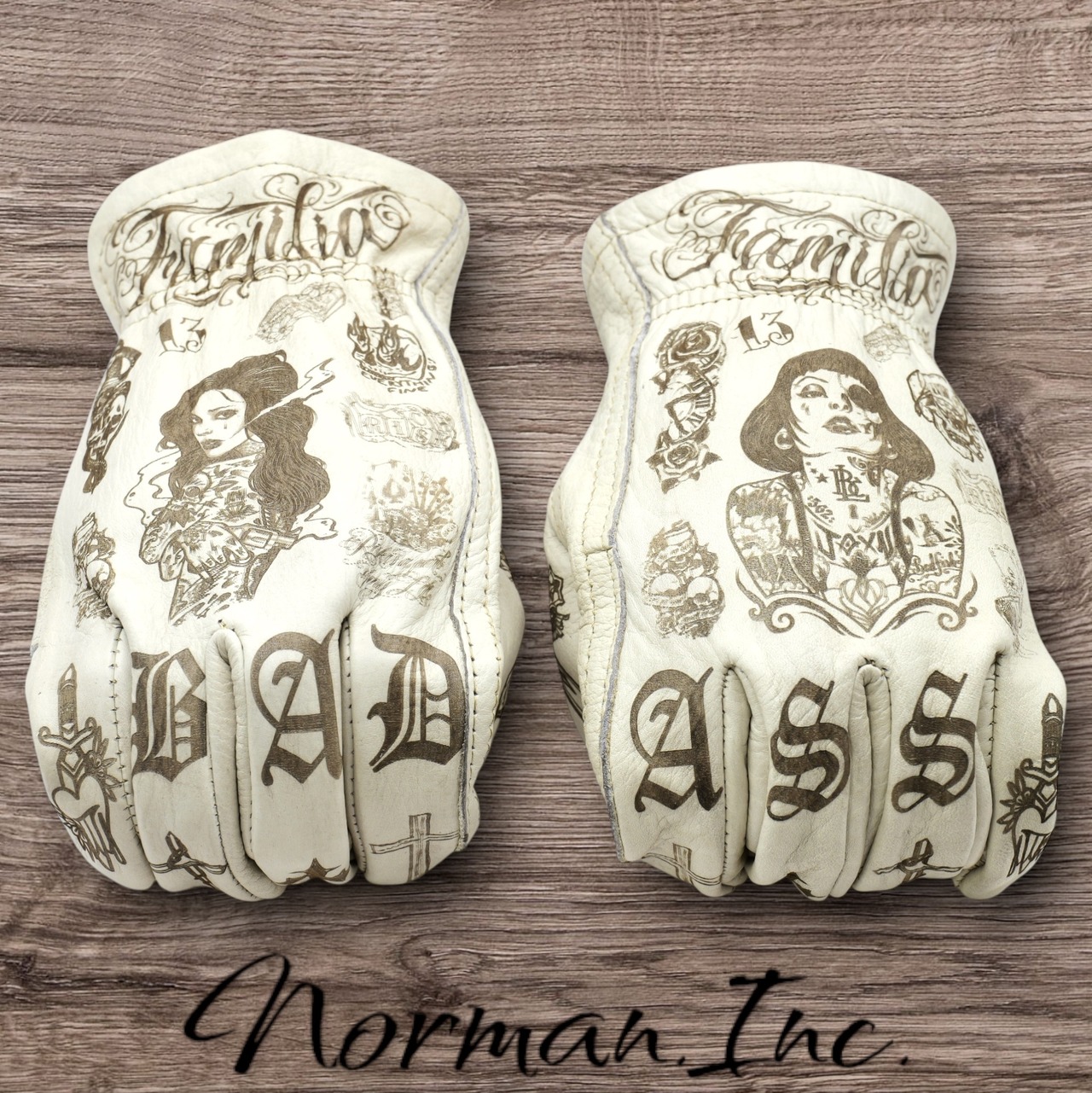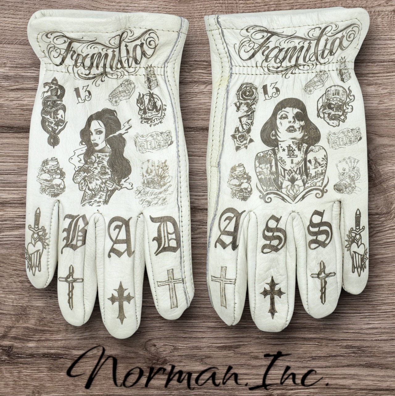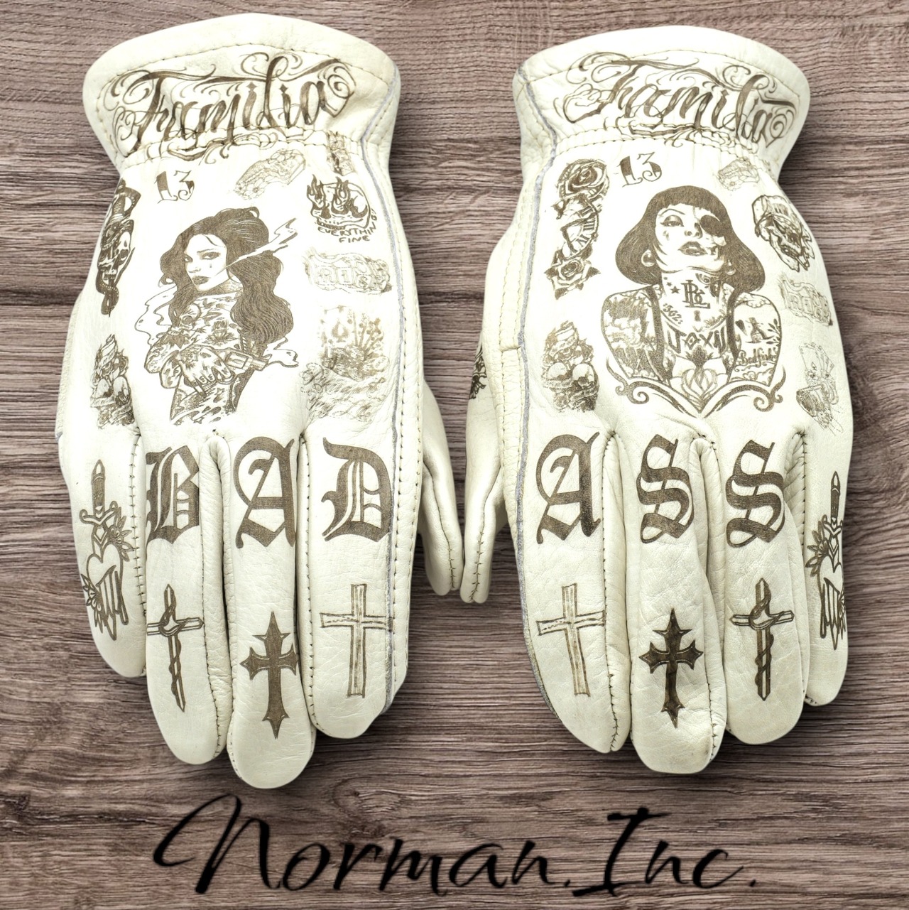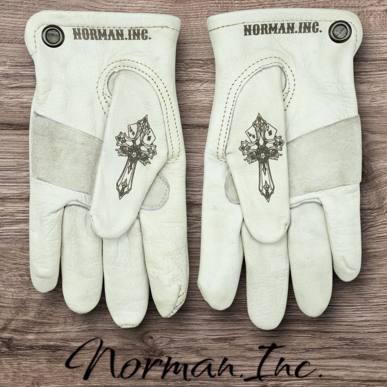 アメリカンタトゥーデザインを施した、ホワイトの牛革レザーグローブになります。