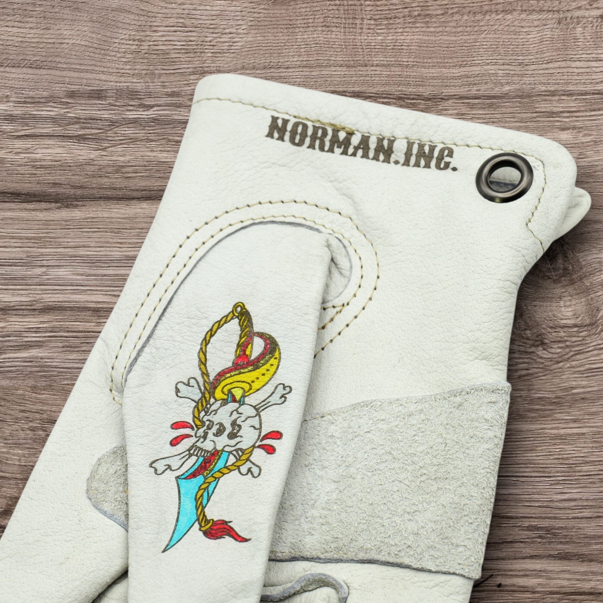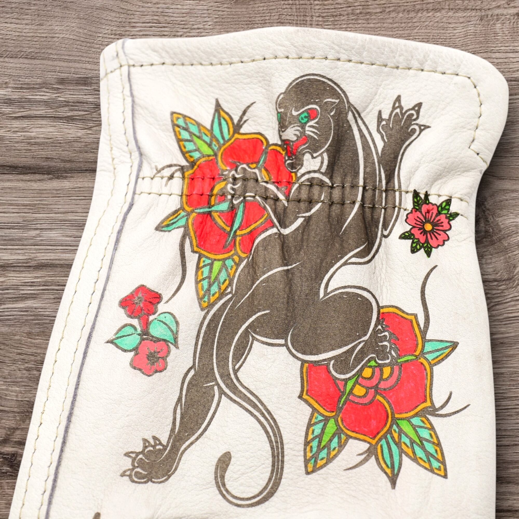 カラー入りトラディショナルタトゥーデザインを施した、ホワイトの牛革レザーグローブになります。