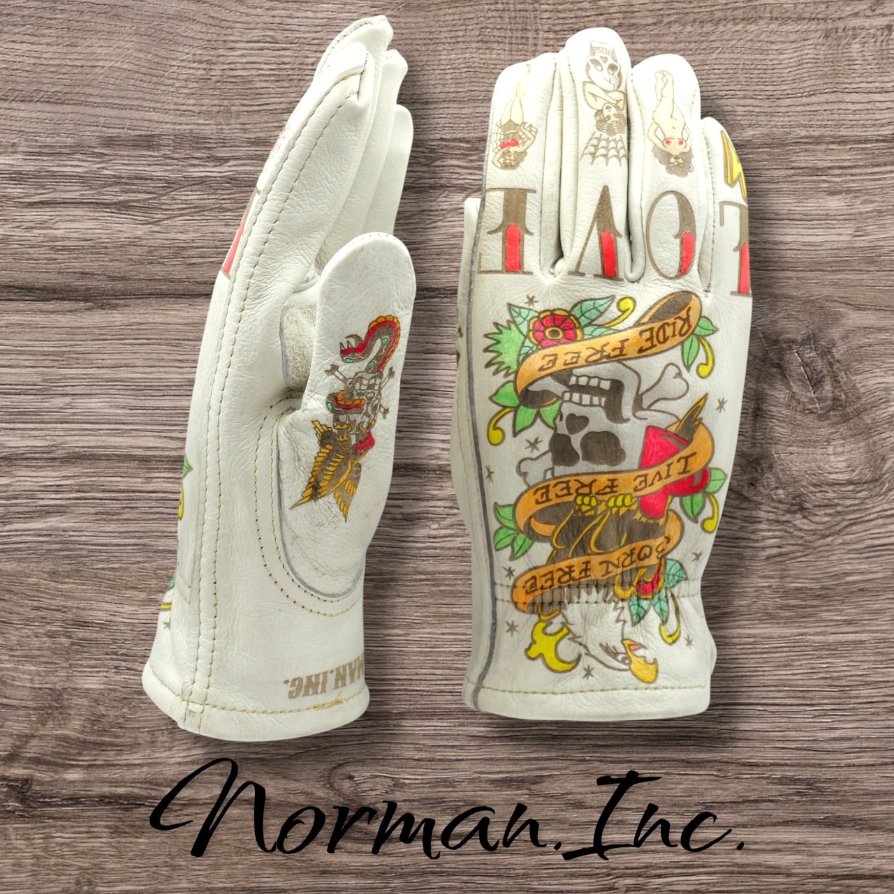 牛革 レザーグローブ ホワイト 白 アメリカン バイク ハーレー カスタム タトゥー 手袋 ツーリング M,Lサイズ