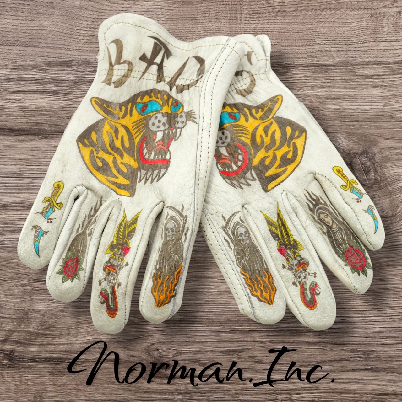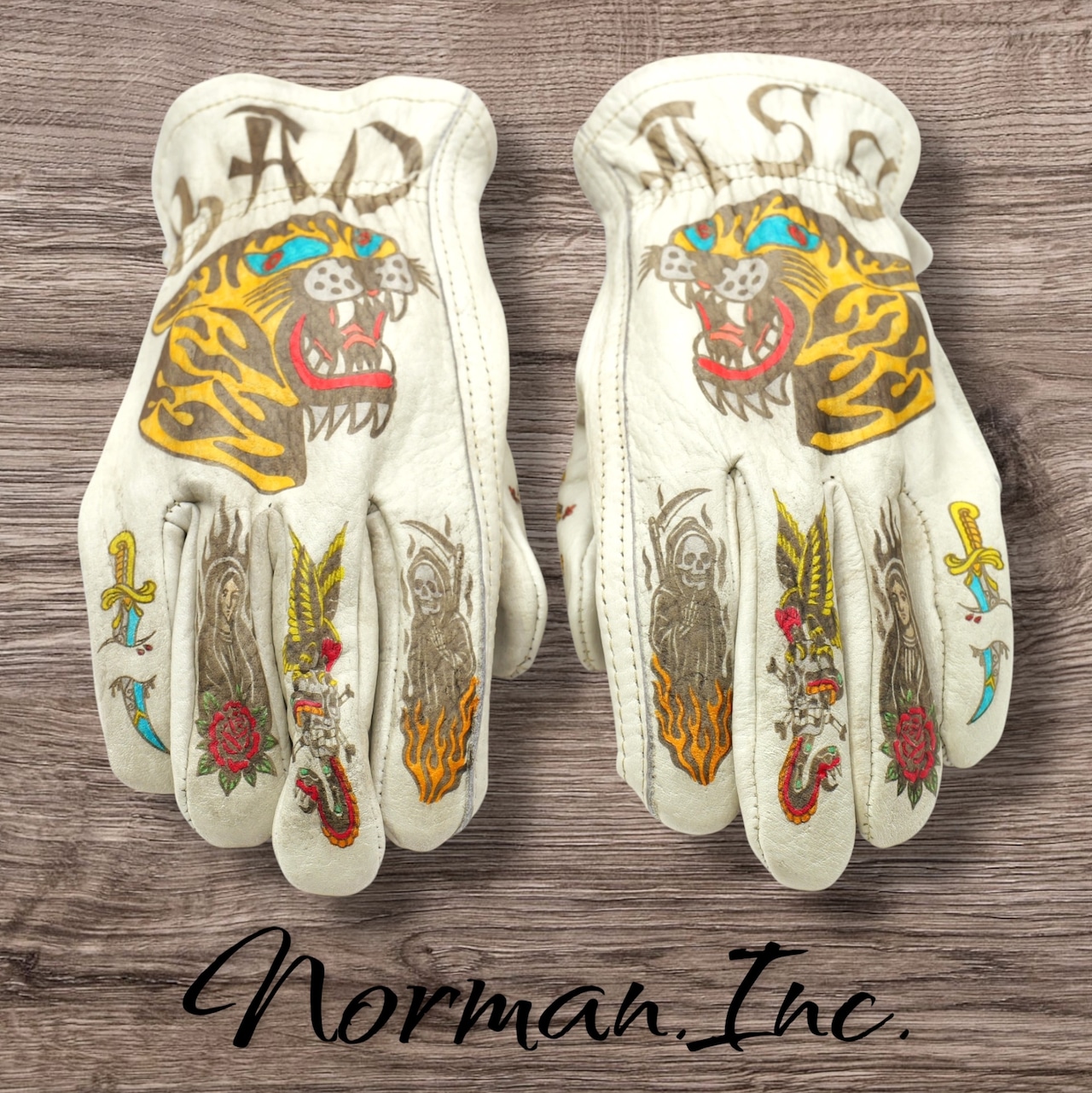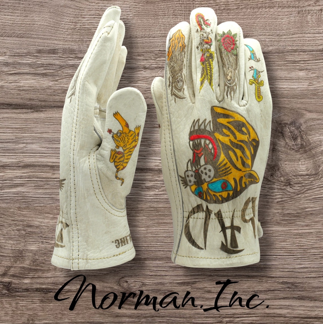 牛革 レザーグローブ ホワイト 白 アメリカン バイク ハーレー カスタム タトゥー 手袋 ツーリング M,Lサイズ