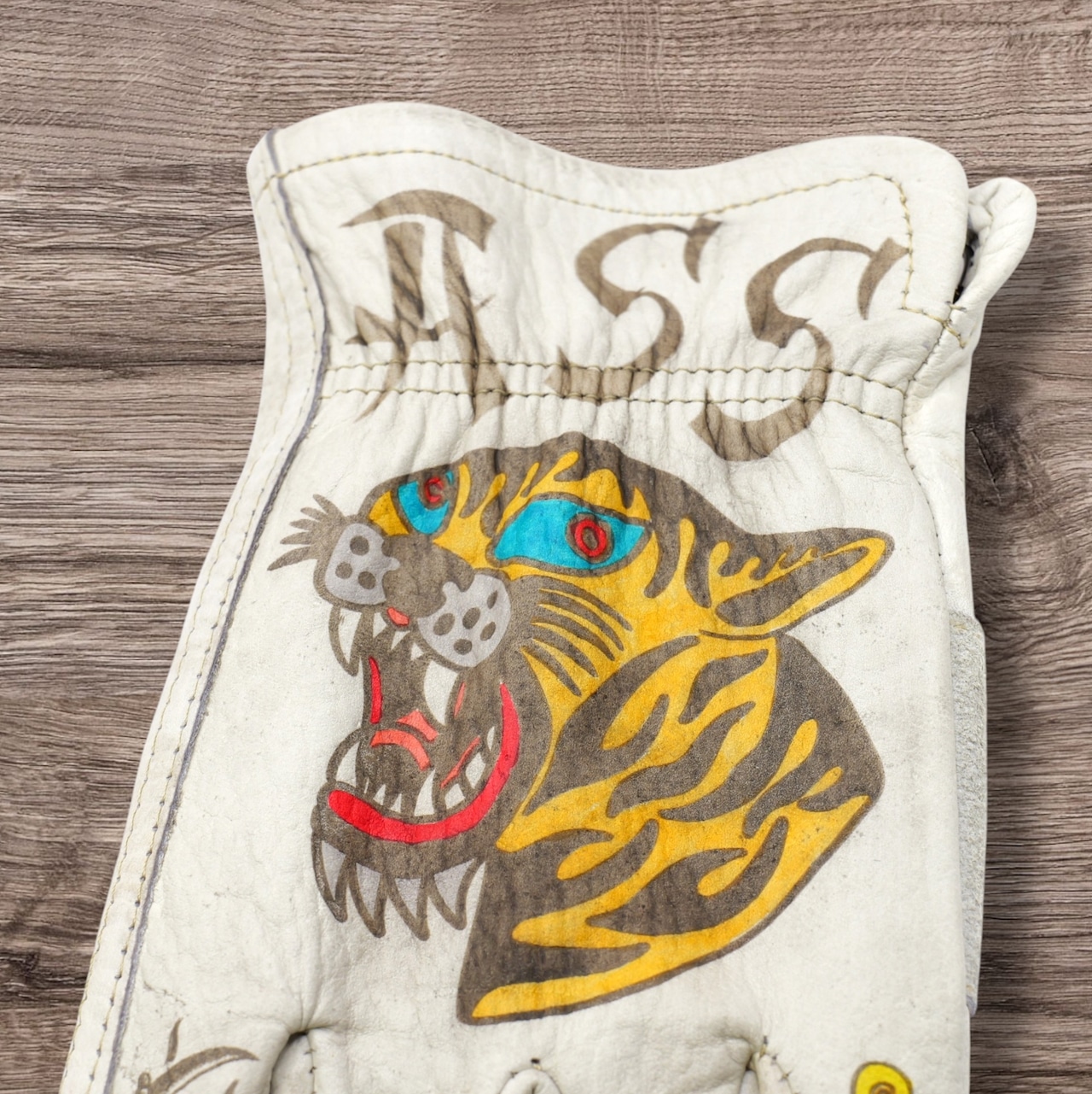 アメトラデザインを施した、ホワイトの牛革レザーグローブになります。