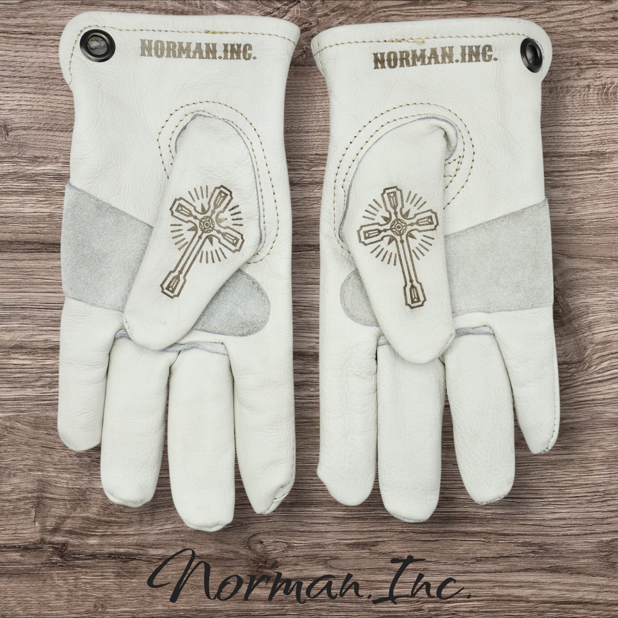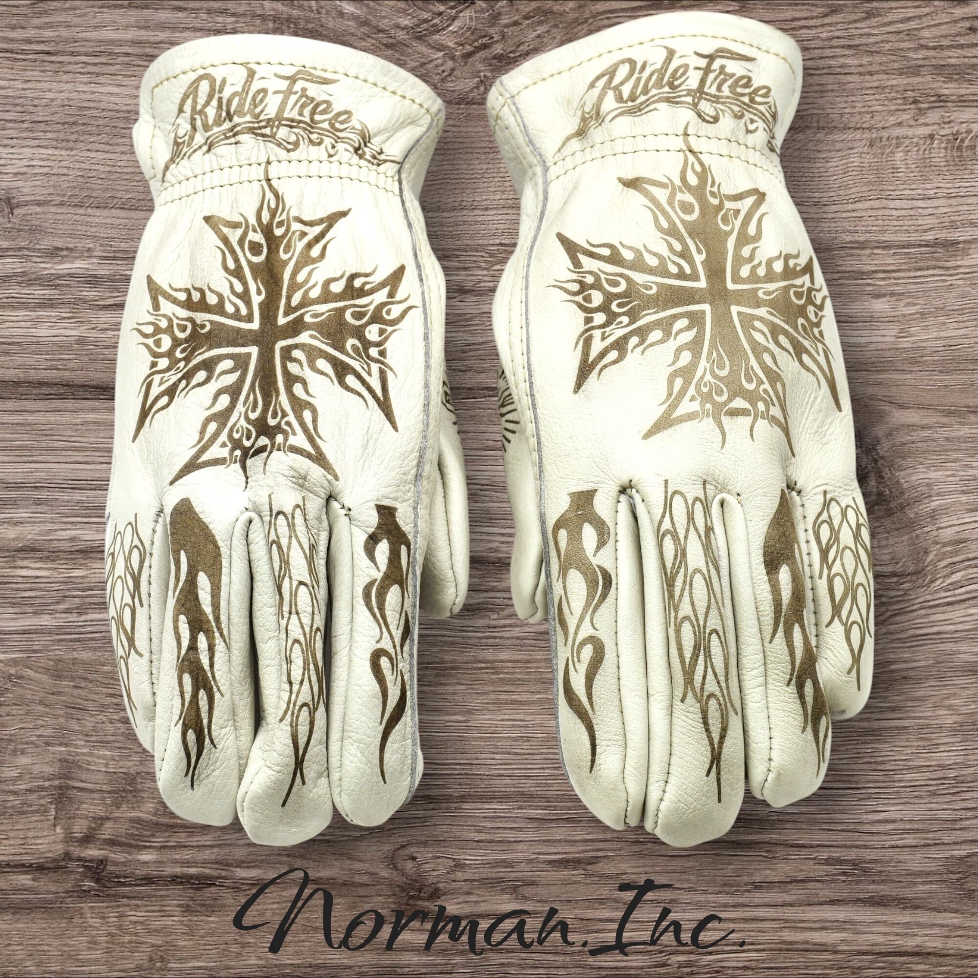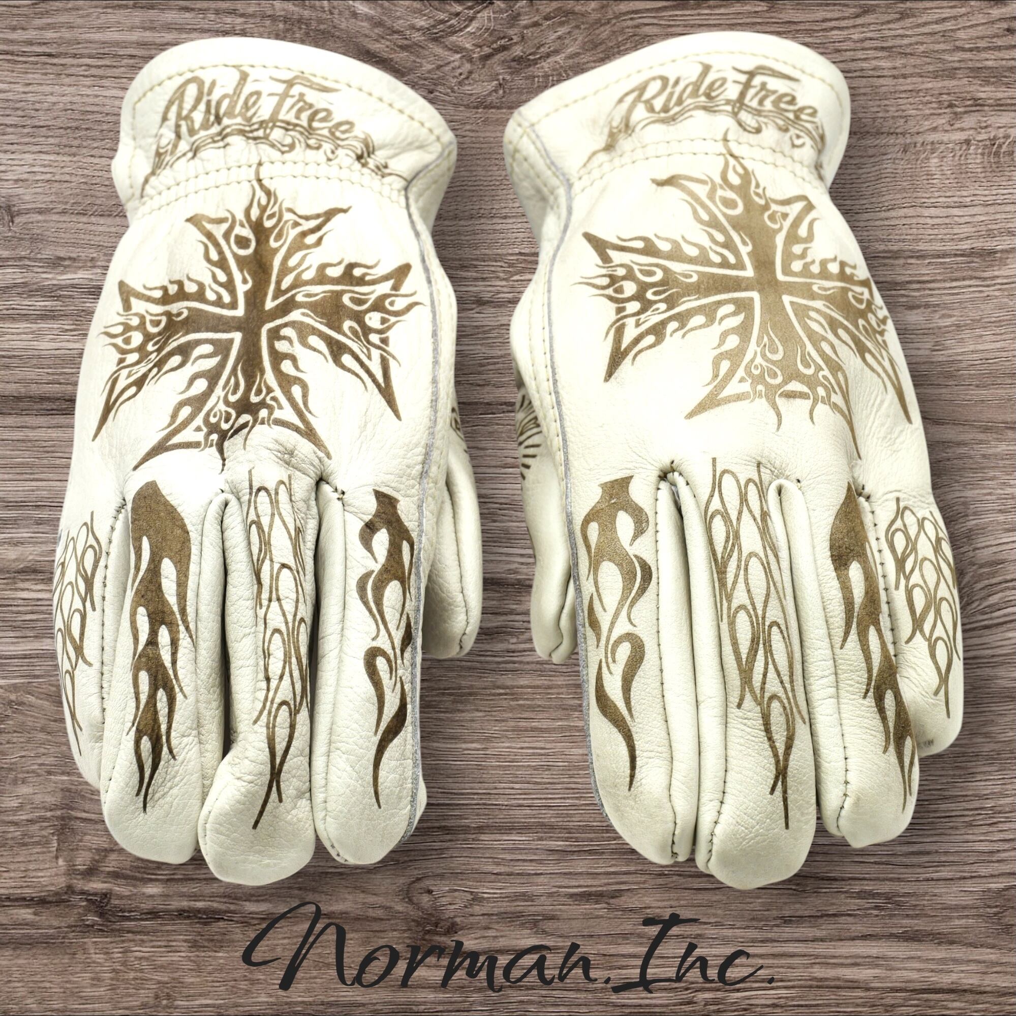 アイアンクロス×フレイムスデザインを施した、ホワイトの牛革レザーグローブになります。