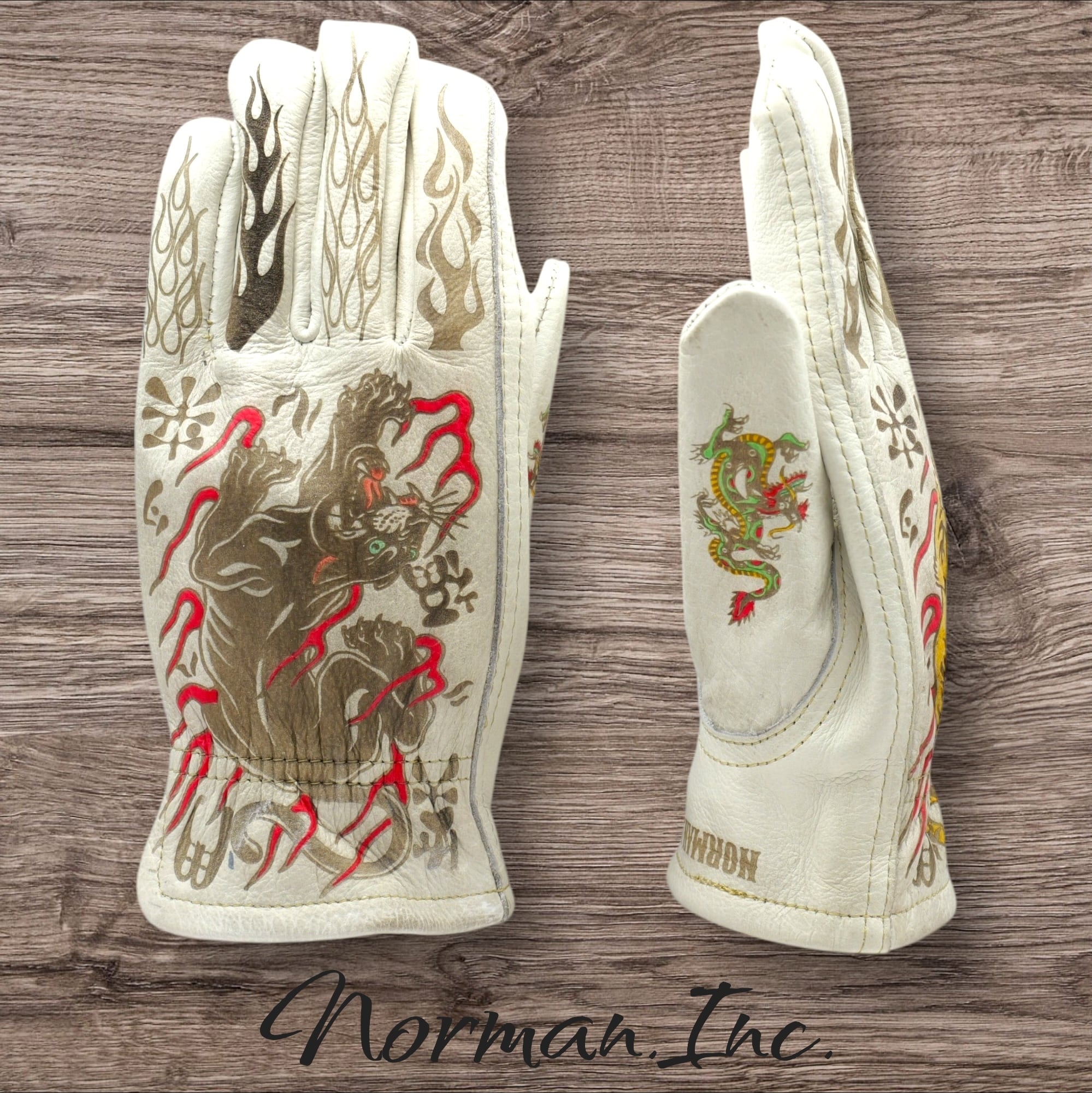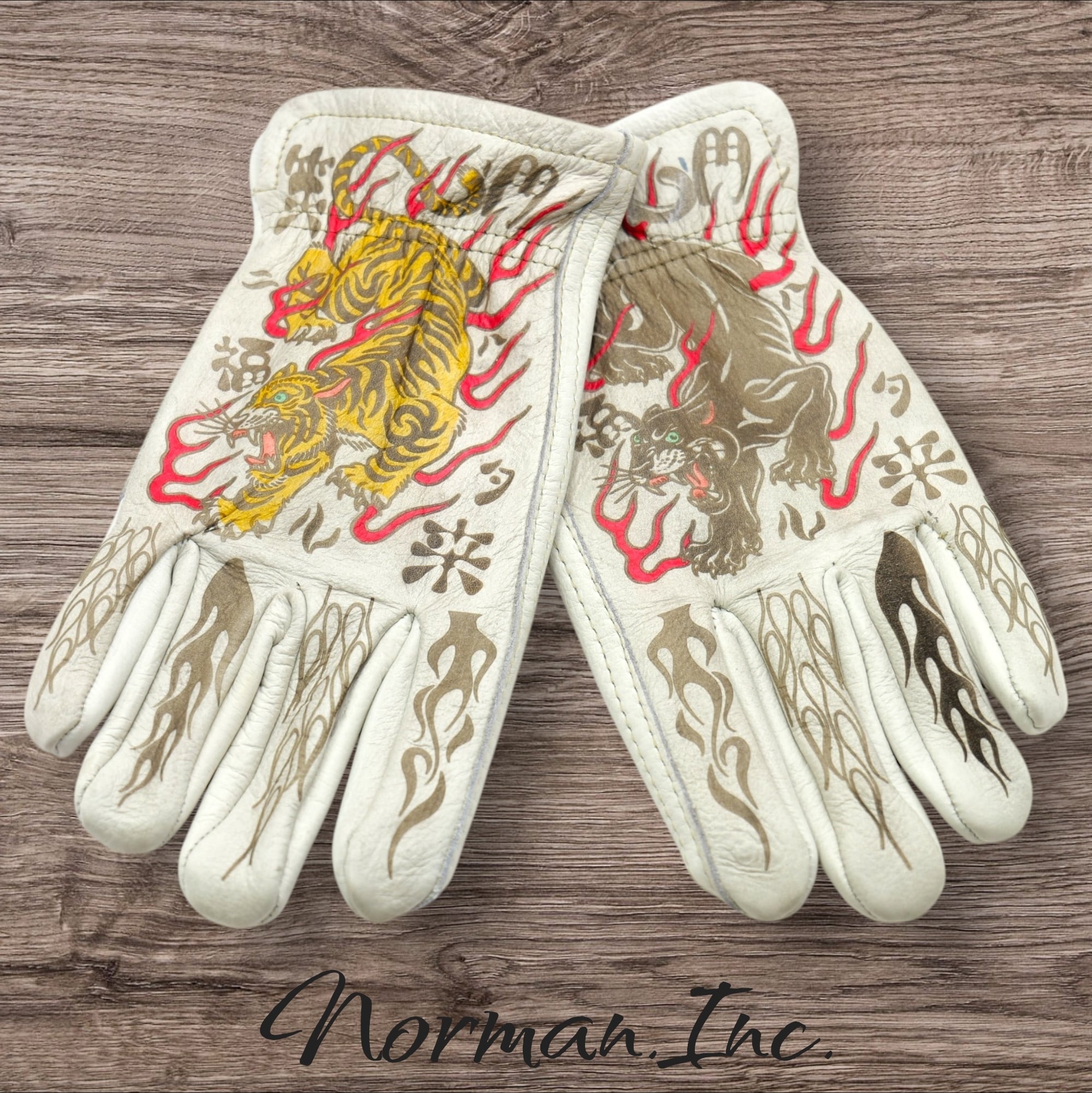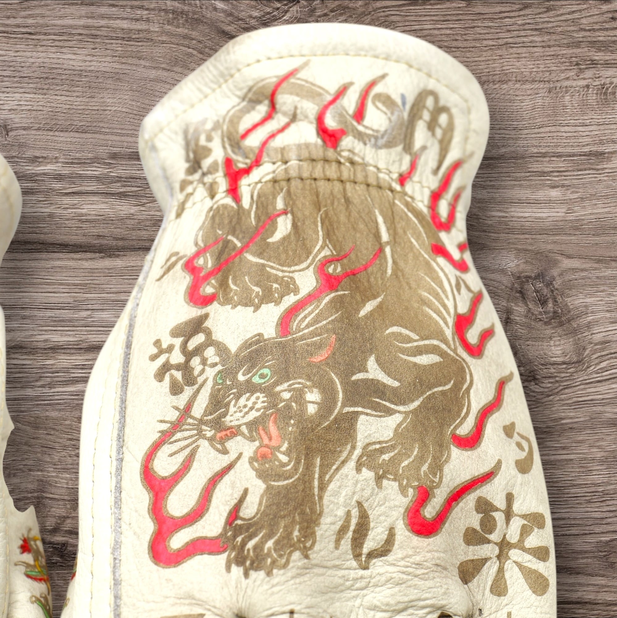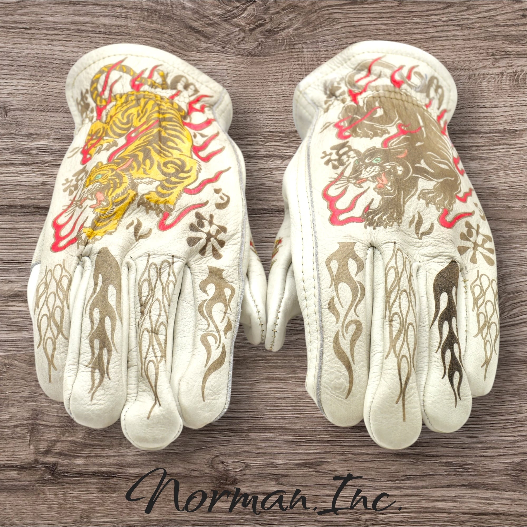 虎、黒豹デザイン【笑う門には福来たる】を施した、ホワイトの牛革レザーグローブになります。
