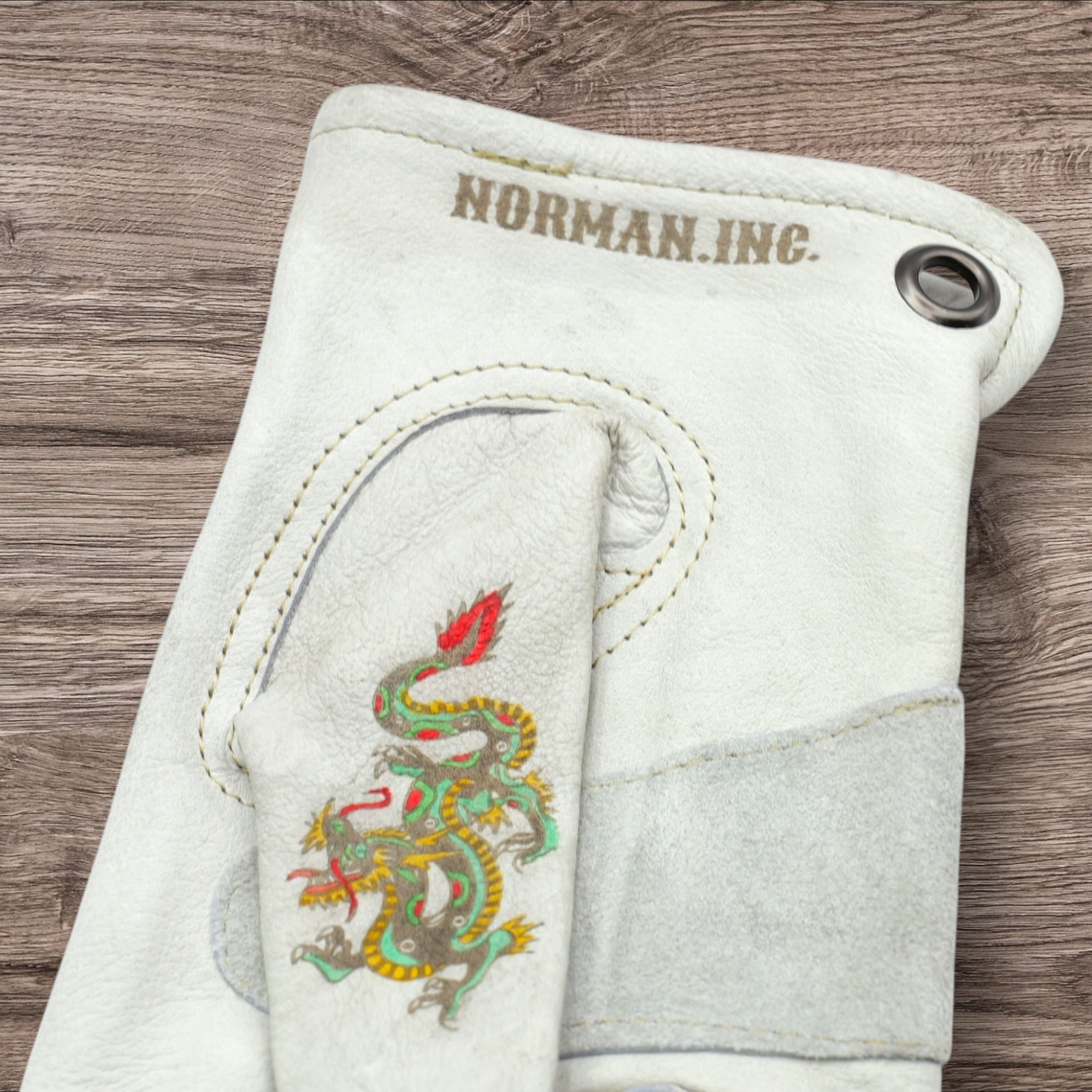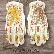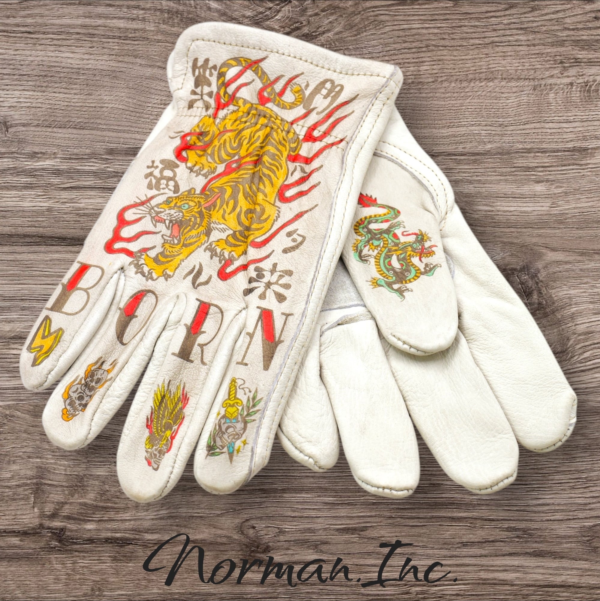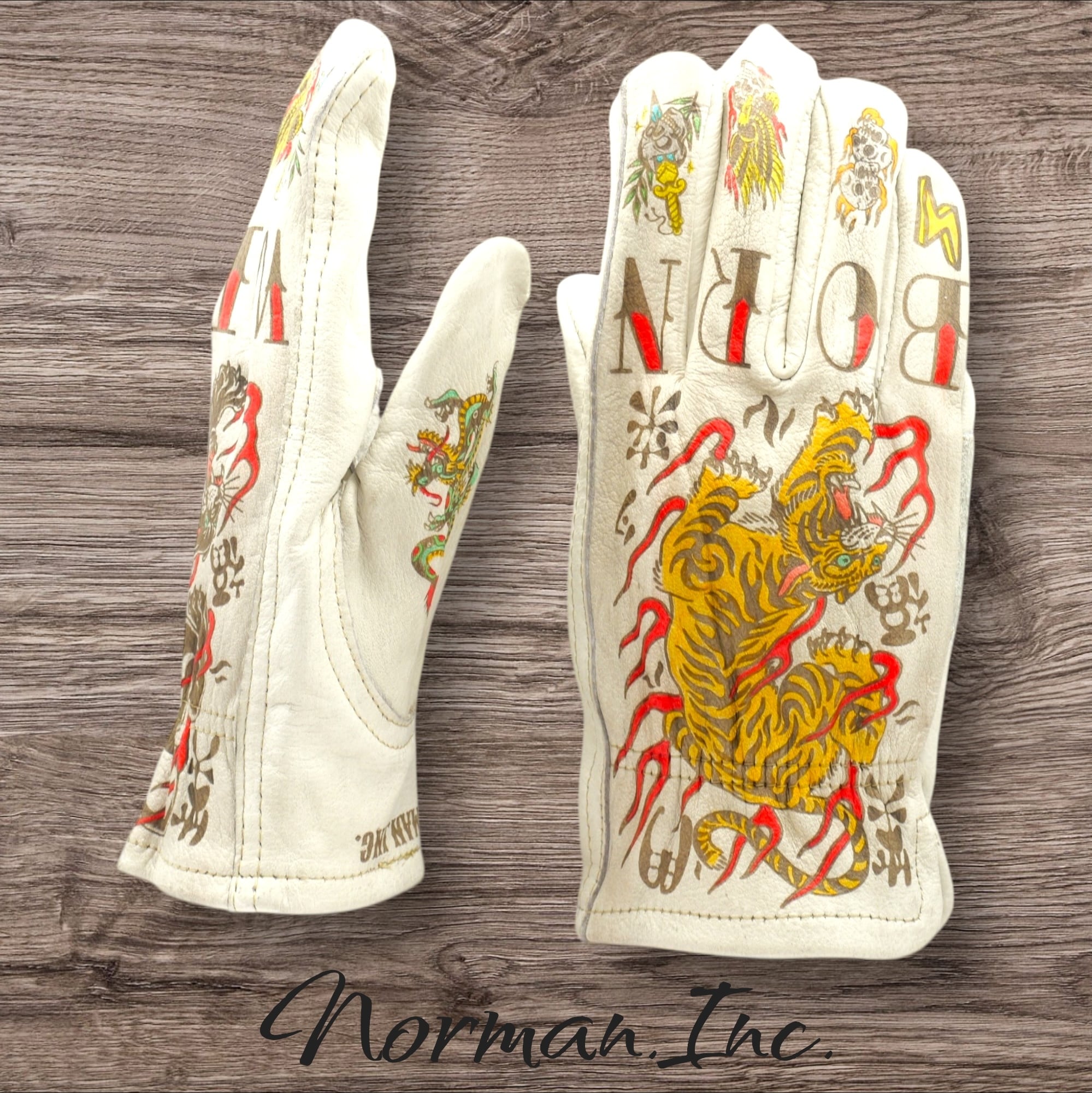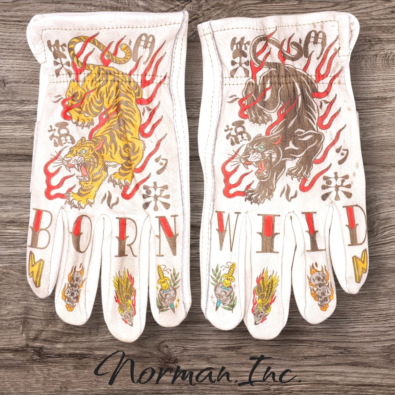 虎、黒豹デザイン【笑う門には福来たる】を施した、ホワイトの牛革レザーグローブになります。