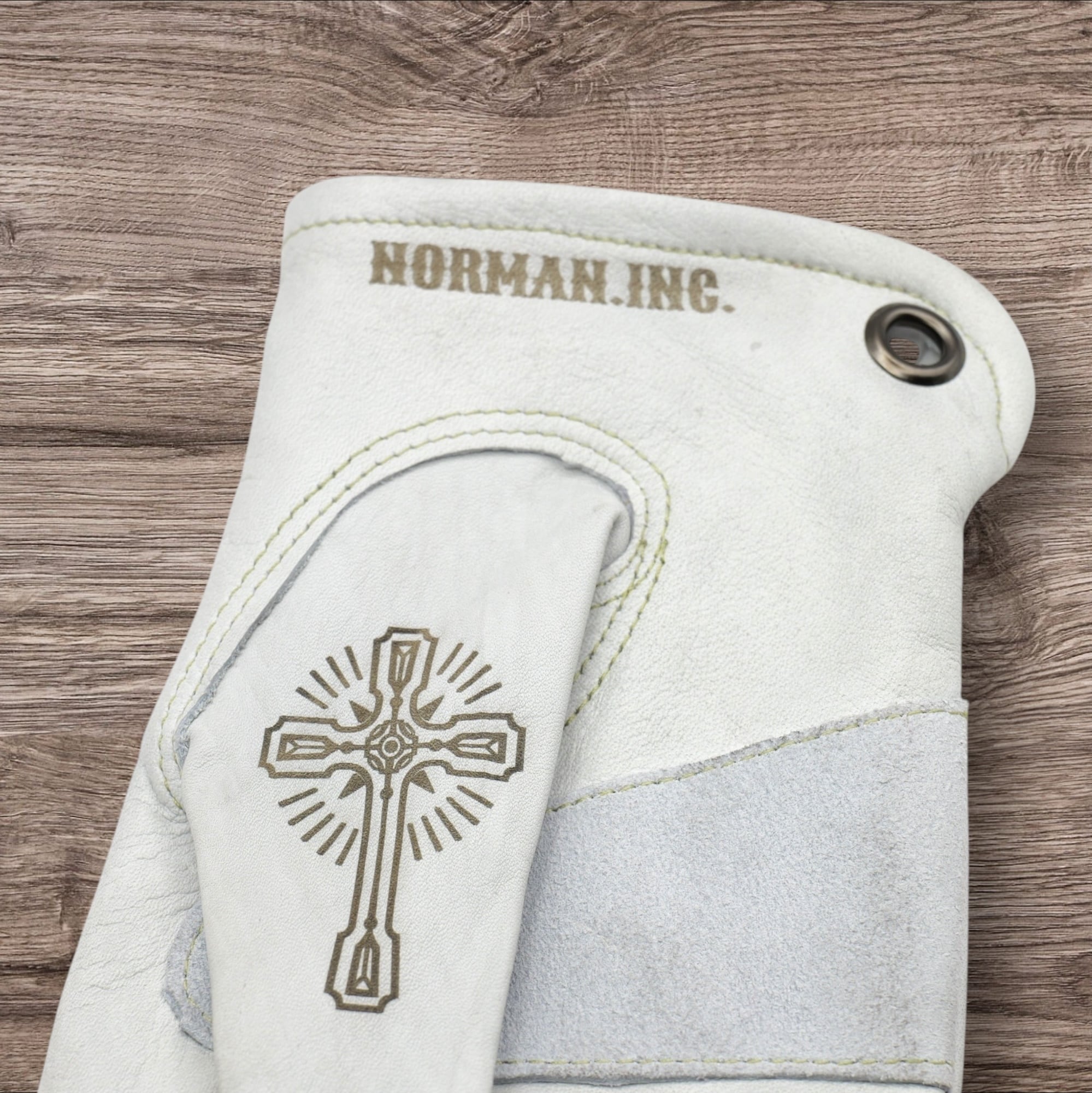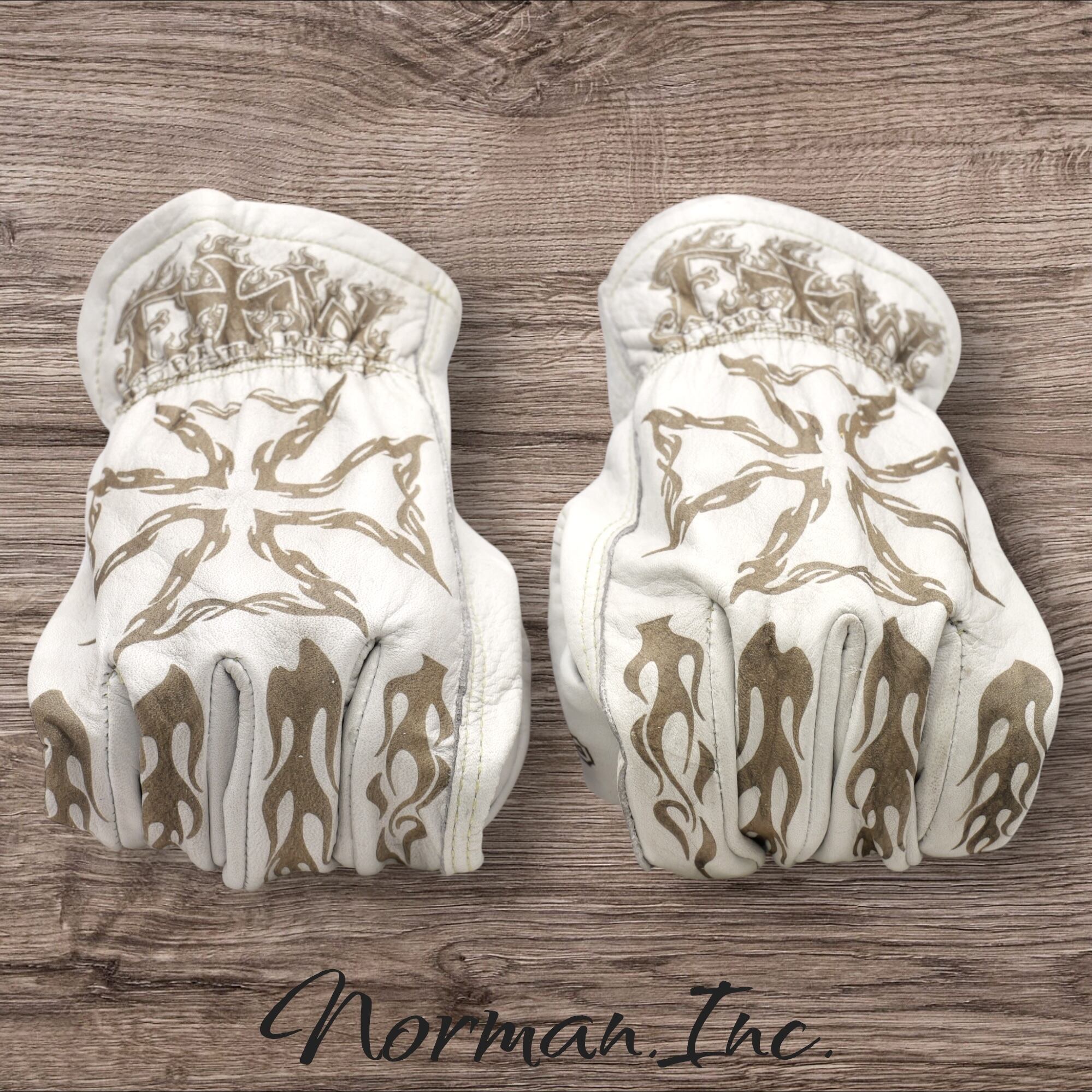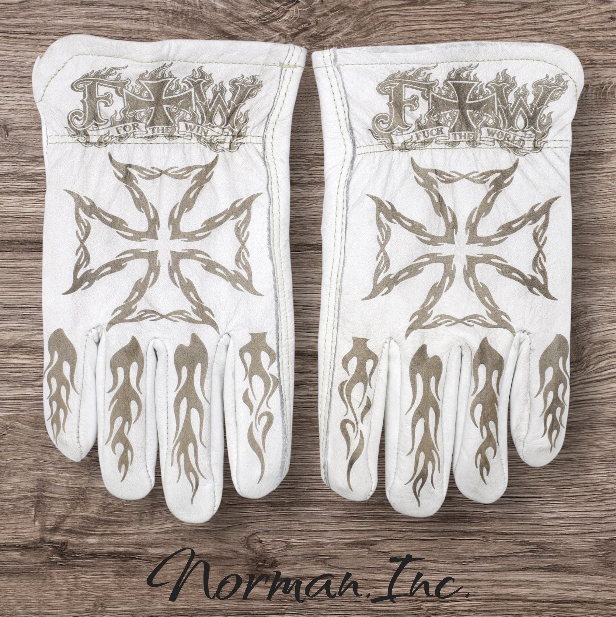 フレイムス×アイアンクロスデザインを施したホワイトの牛革レザーグローブになります。