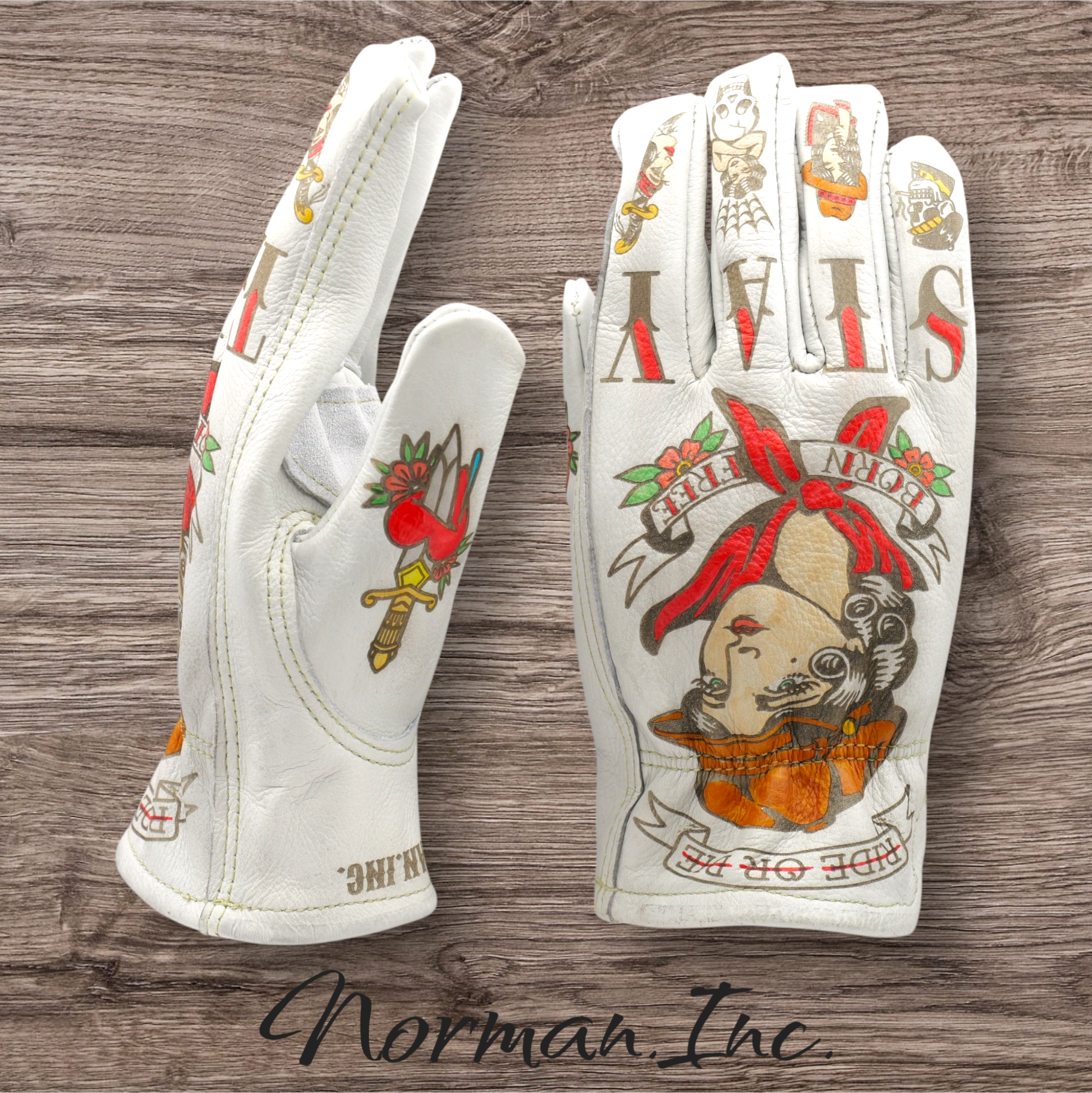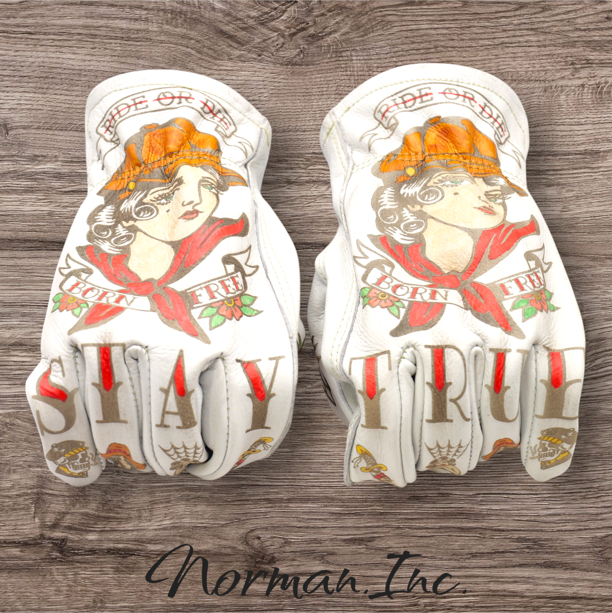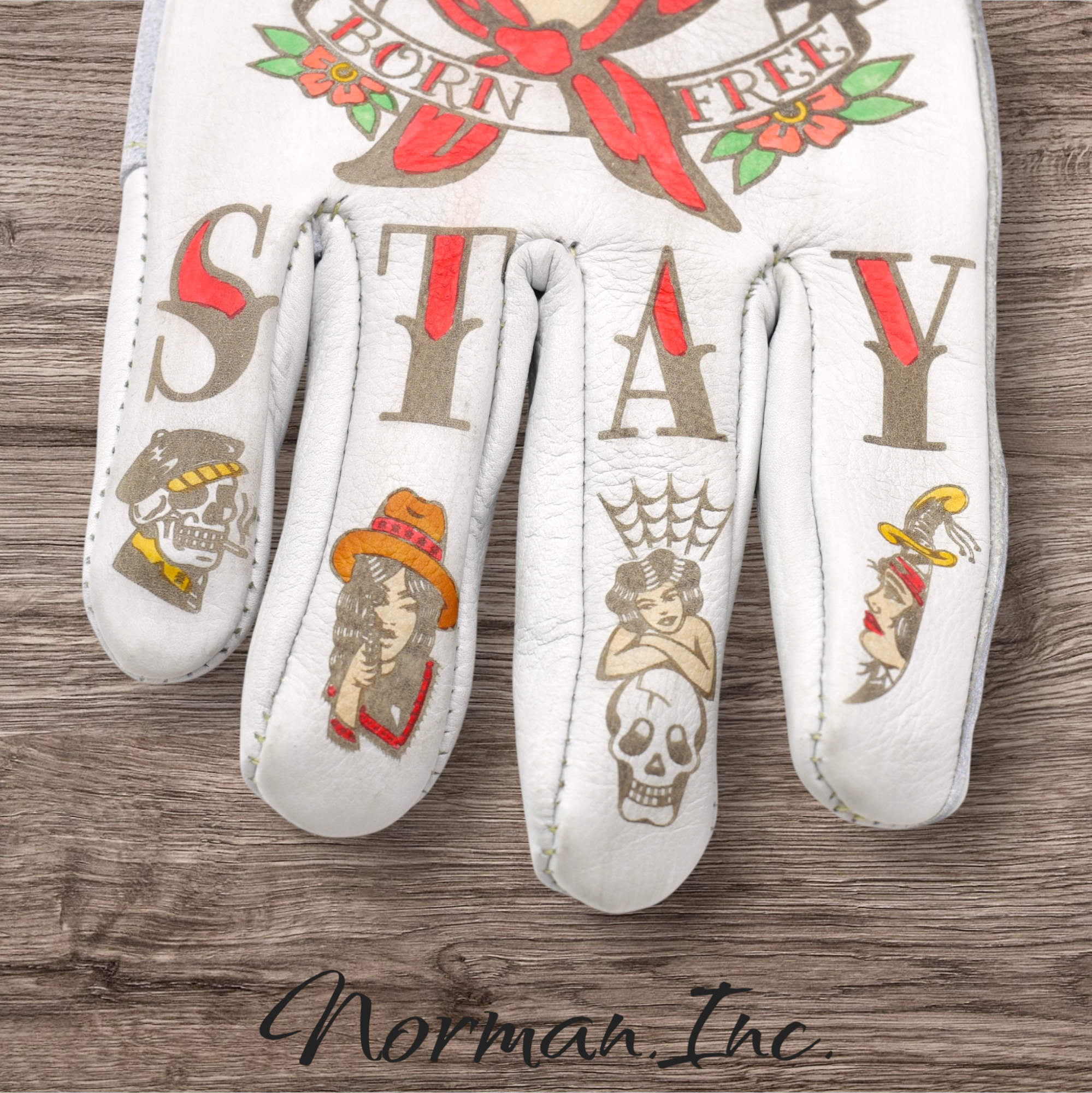 牛革 レザーグローブ ホワイト 白 アメリカン バイク ハーレー カスタム タトゥー 手袋 ツーリング  M,L,XLサイズ