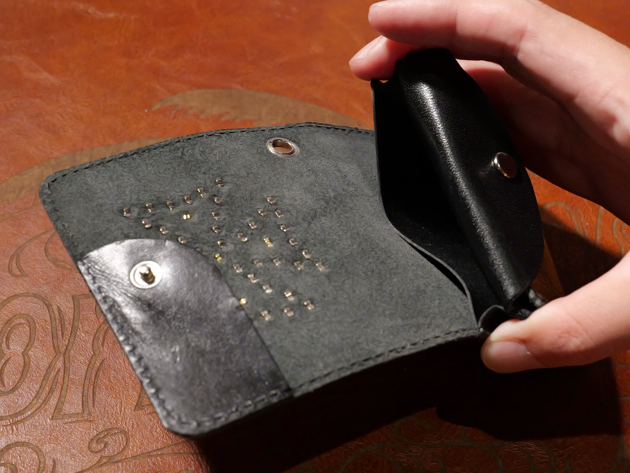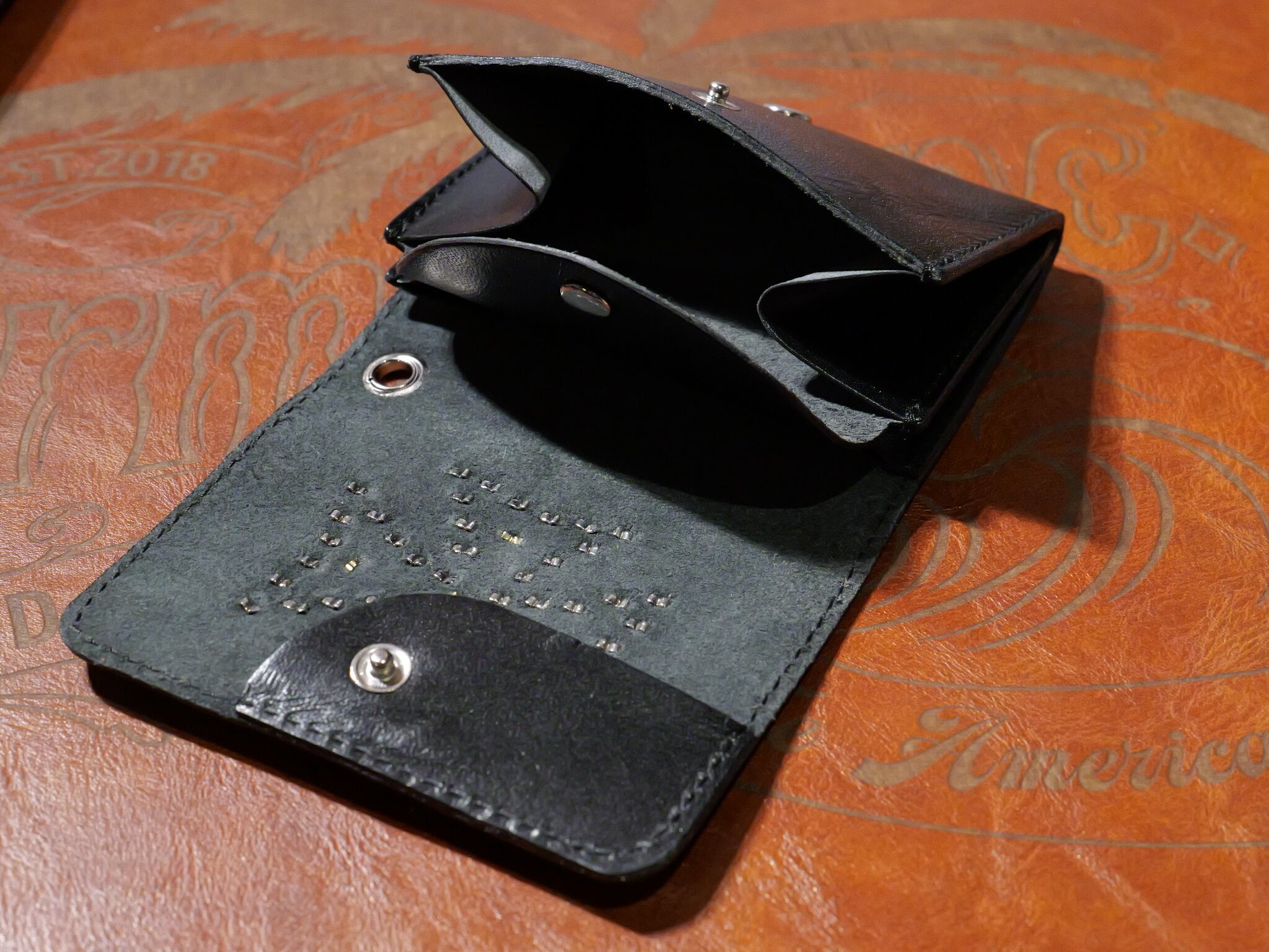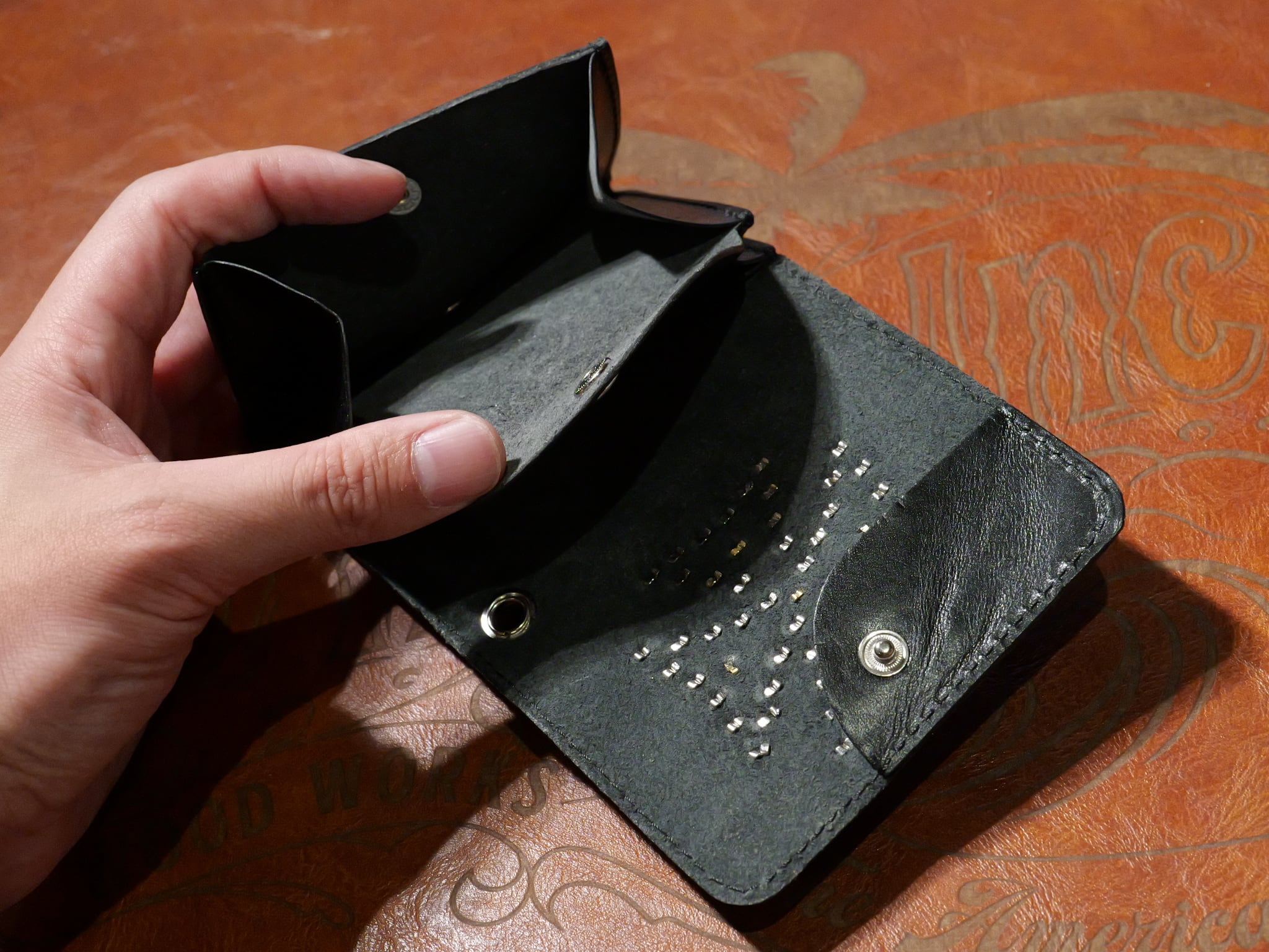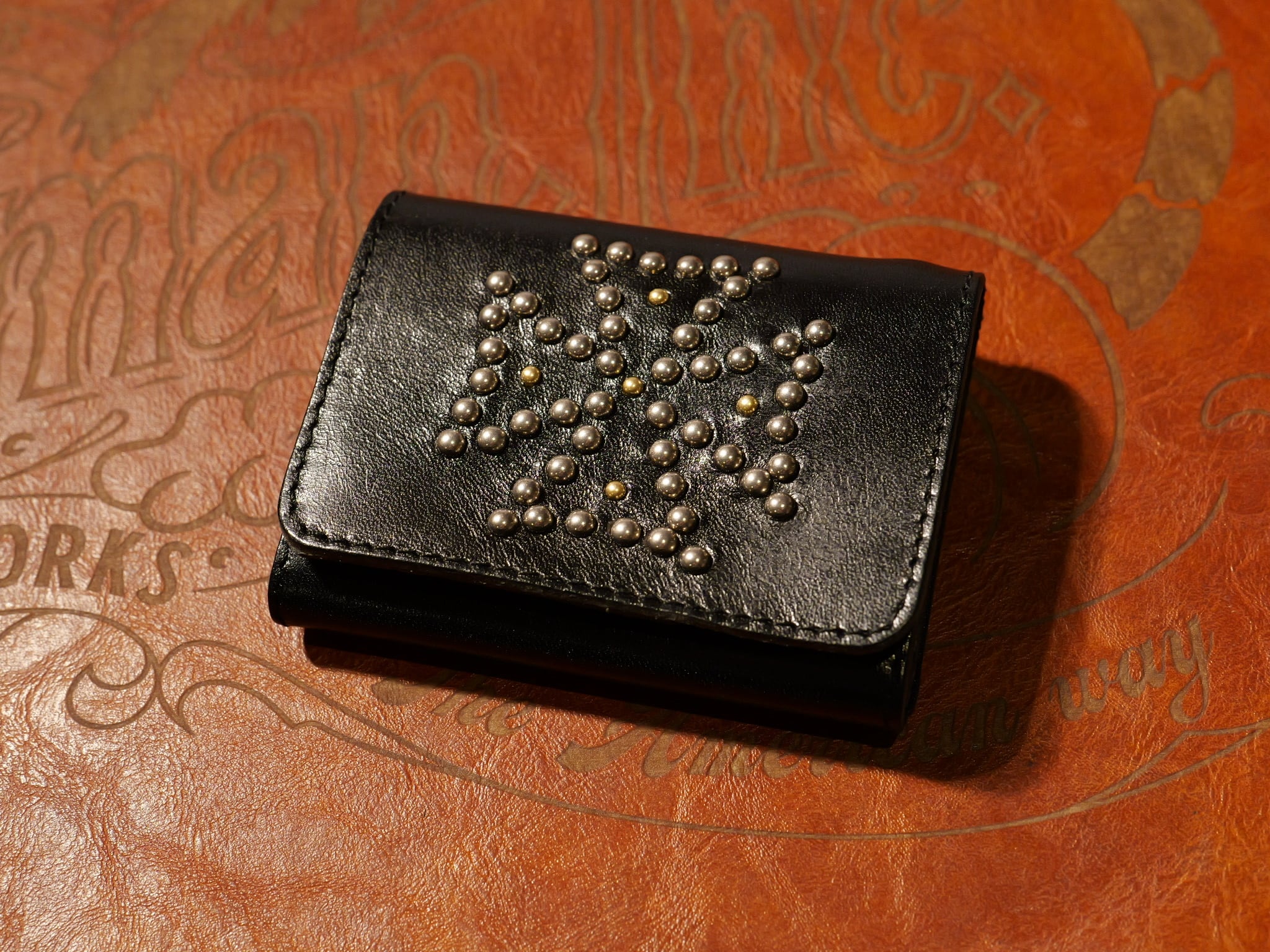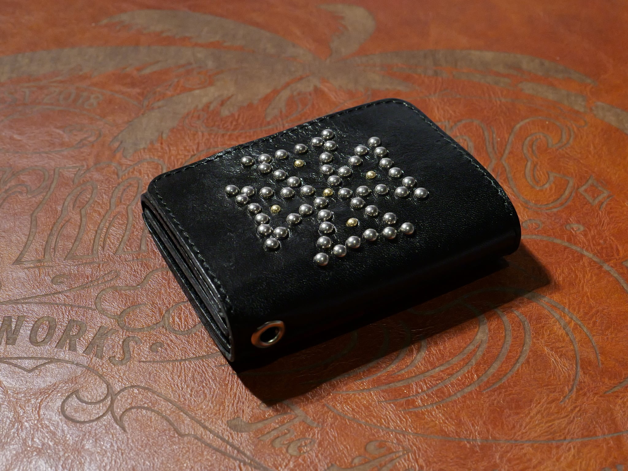 栃木レザーに伝統的なスタンダードリベット社製アメリカンスポッツを使用し、アイアンクロスデザインを施したコンパクト財布。