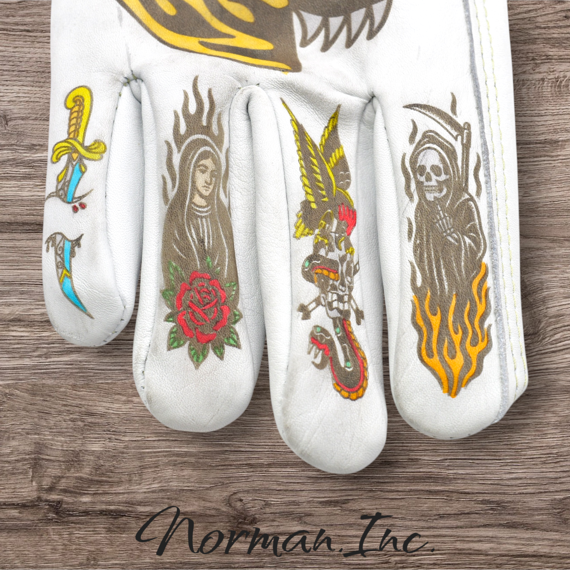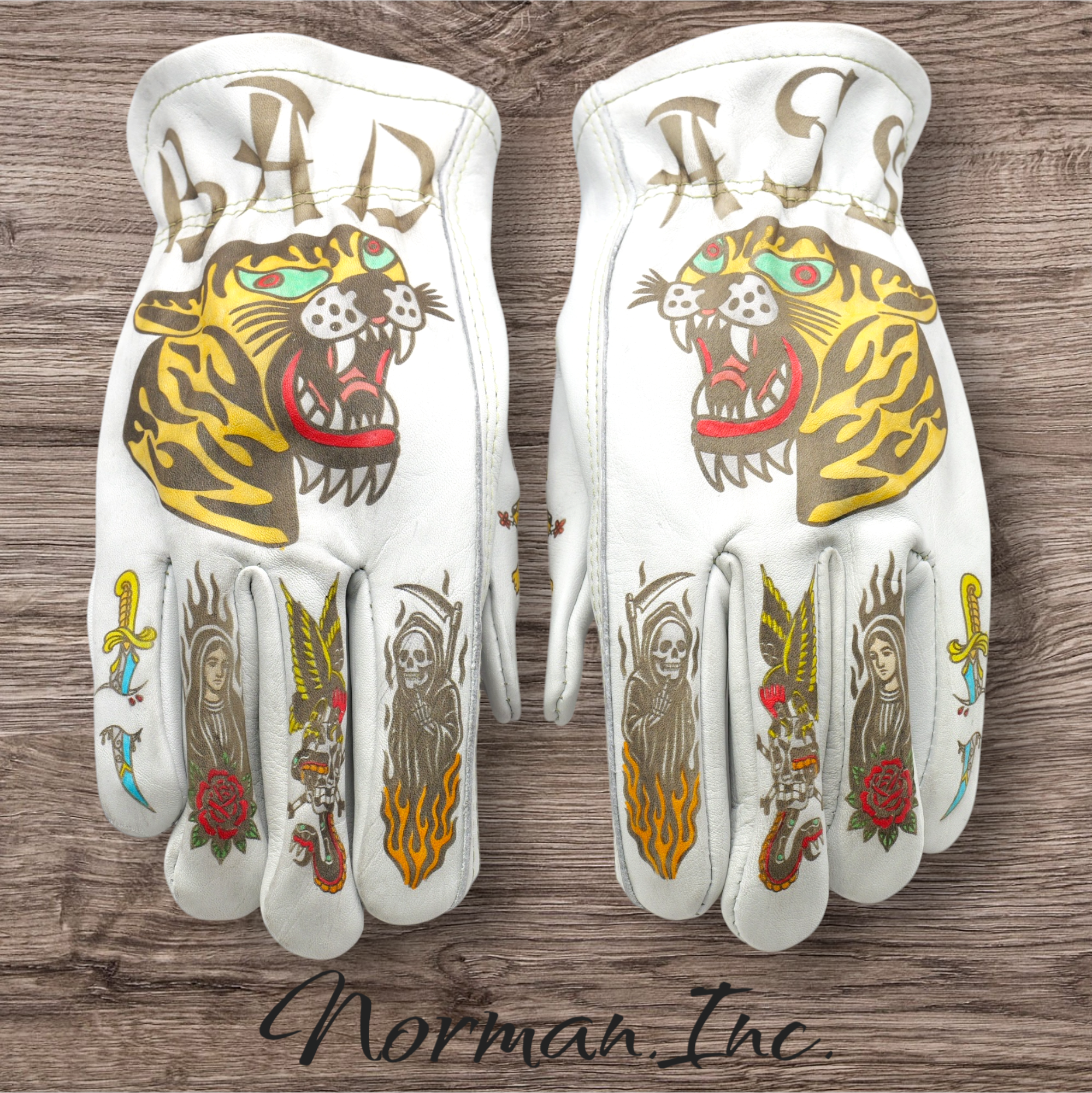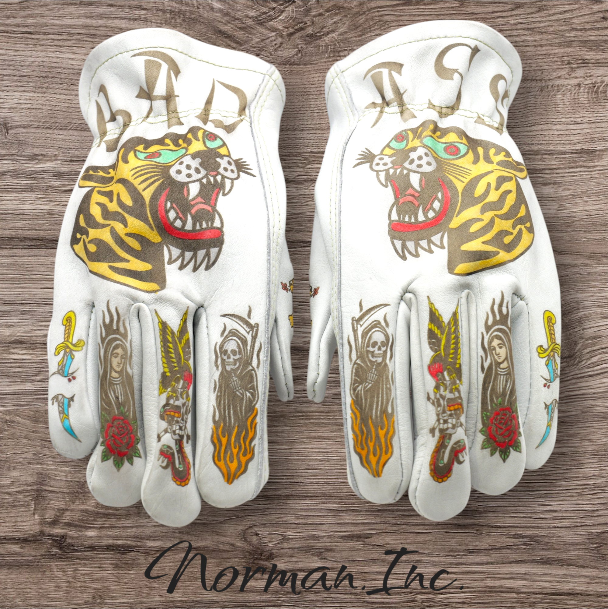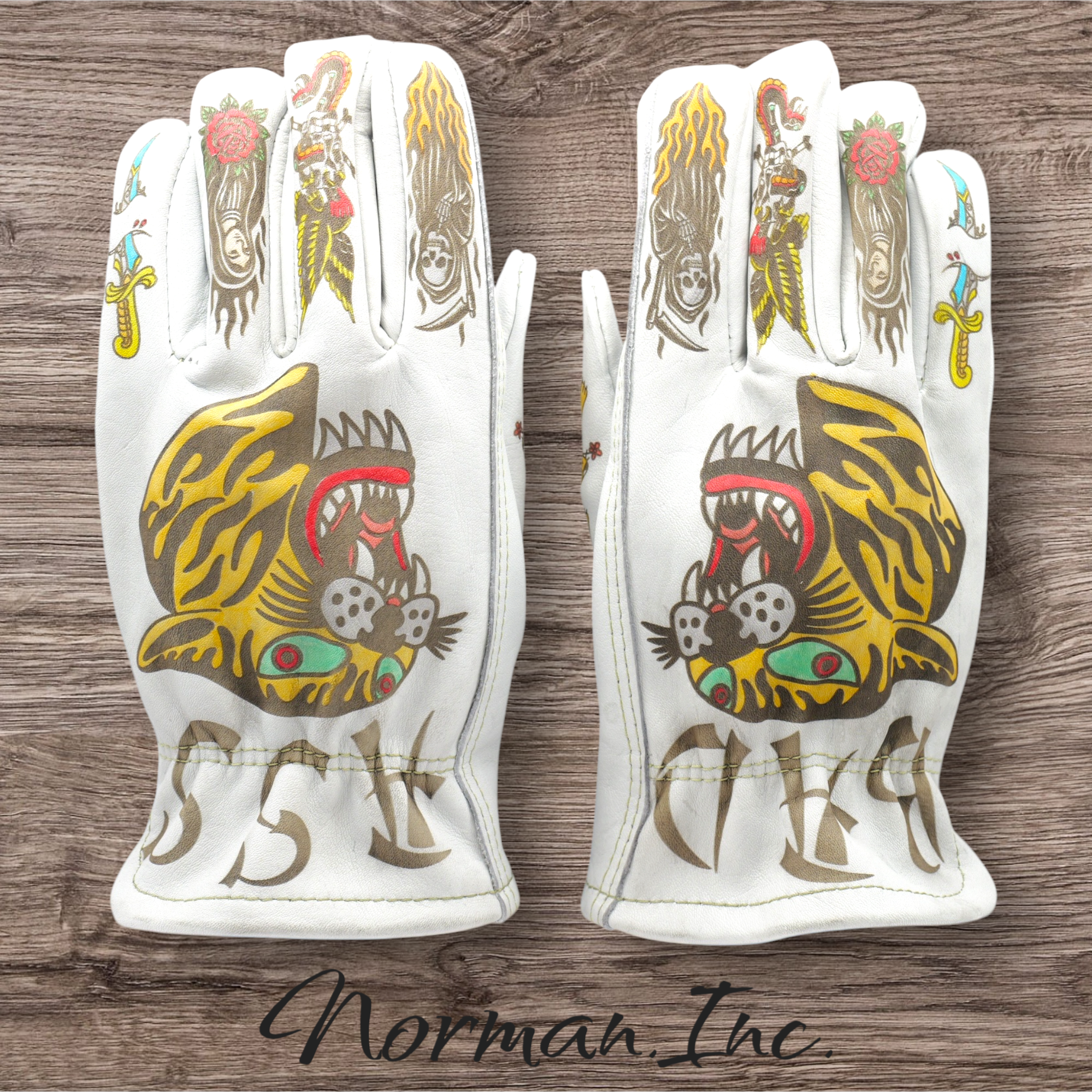 牛革 レザーグローブ ホワイト 白 アメリカン バイク ハーレー カスタム タトゥー 手袋 ツーリング M,L,XLサイズ