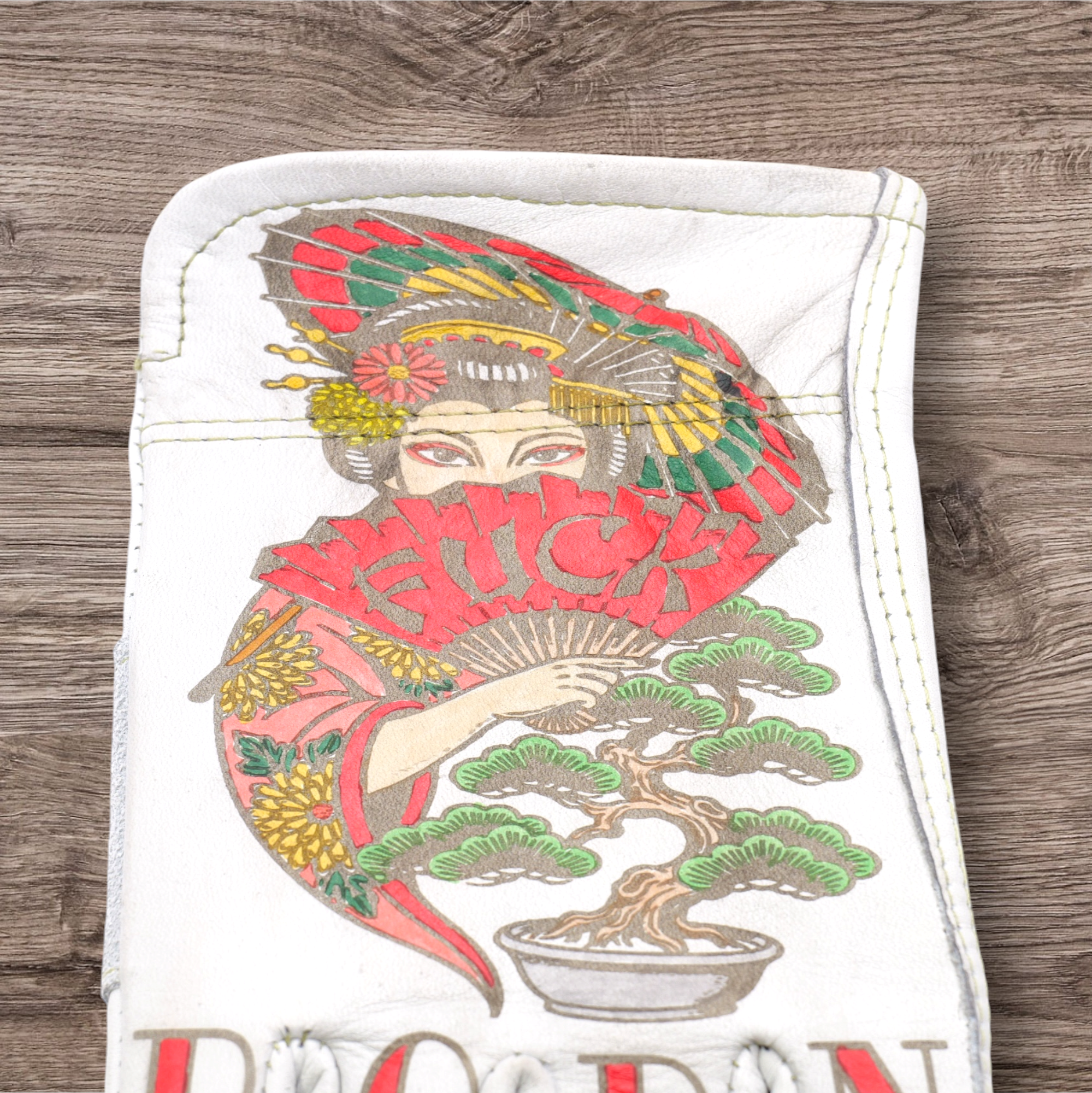 アメトラデザインを施したホワイトの牛革レザーグローブになります。
