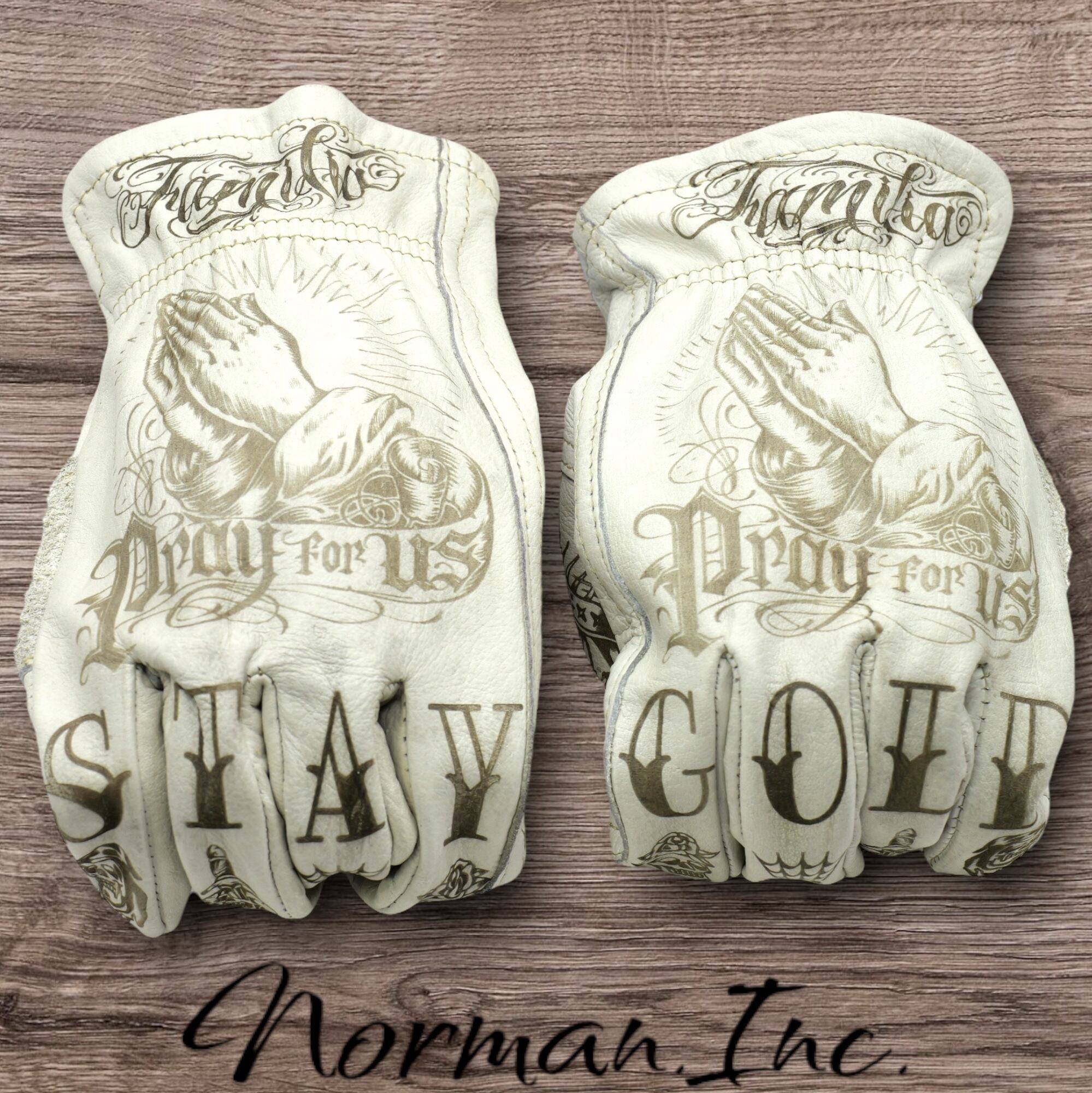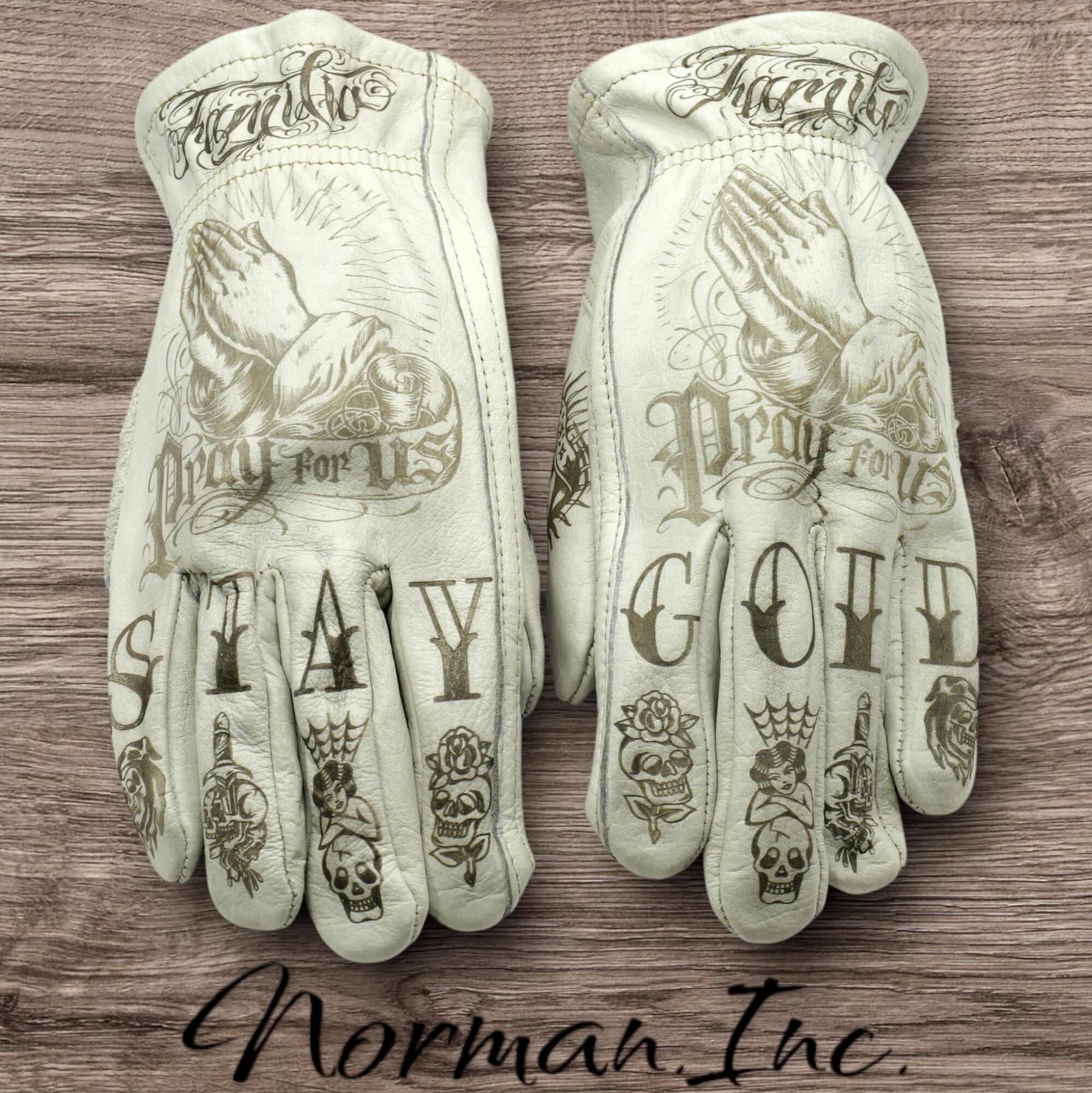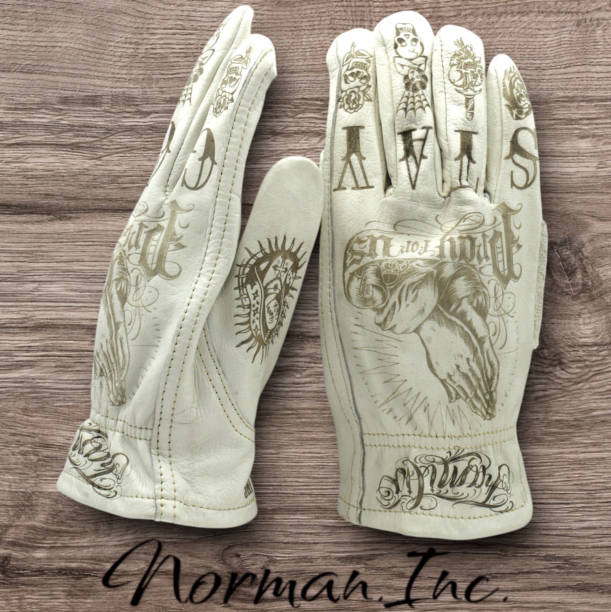 アメリカンタトゥーデザインを施した、ホワイトの牛革レザーグローブになります。