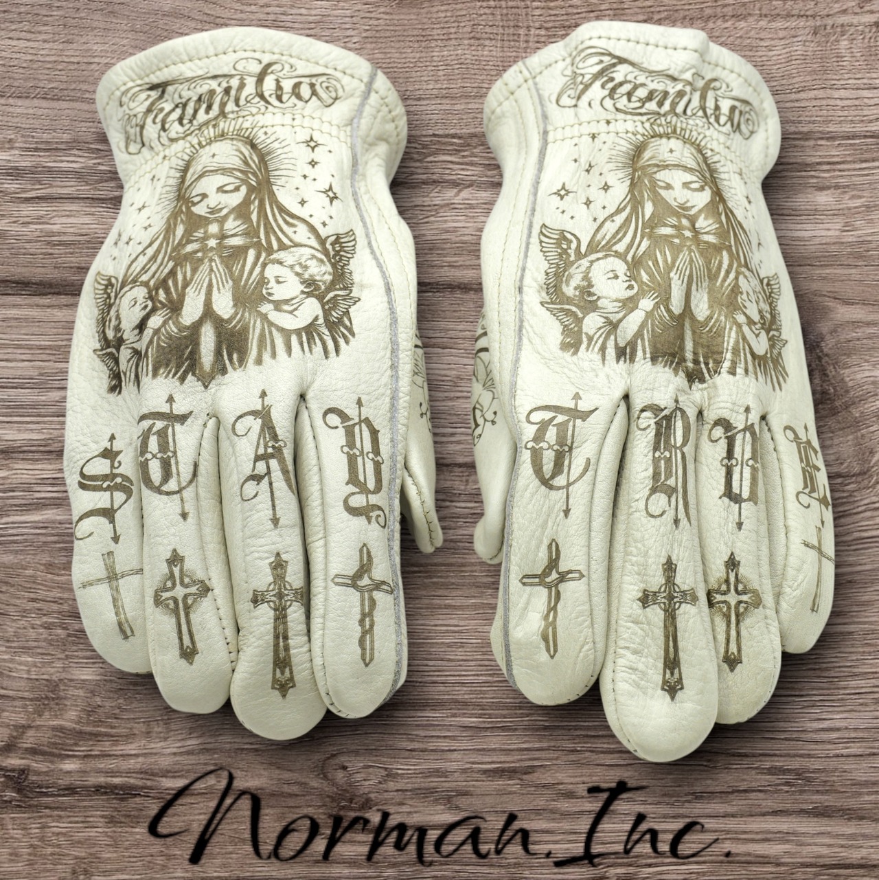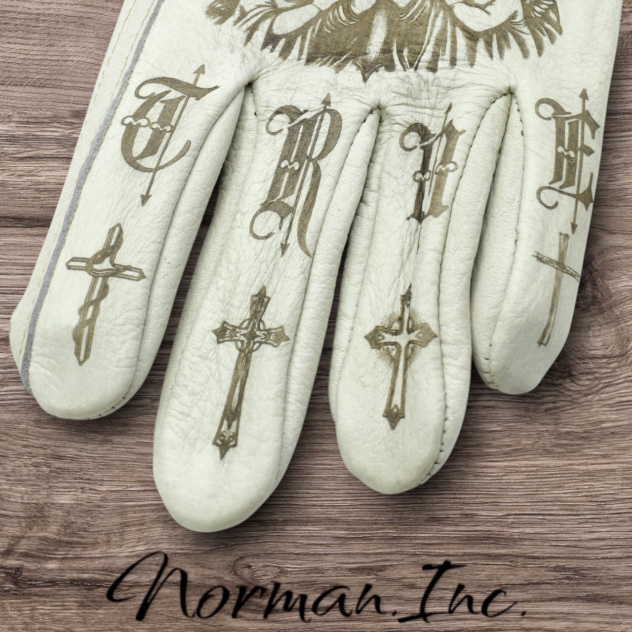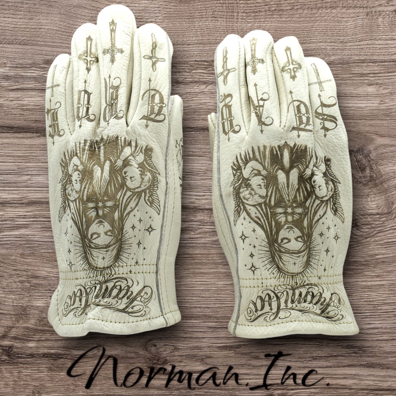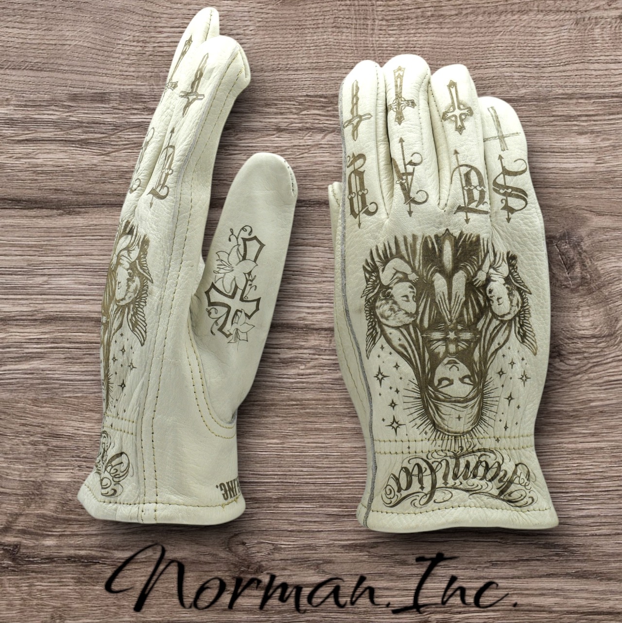 牛革 レザーグローブ ホワイト 白 アメリカン バイク ハーレー カスタム タトゥー 手袋 ツーリング M,Lサイズ