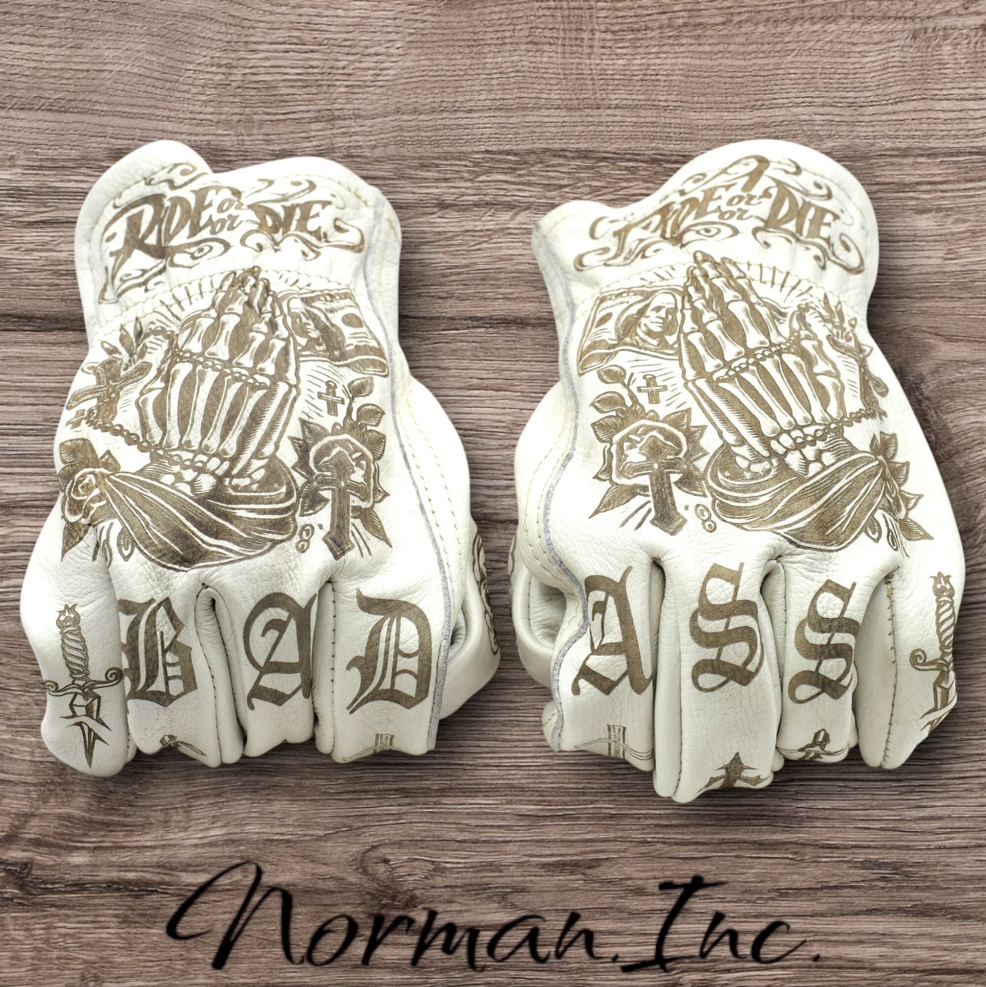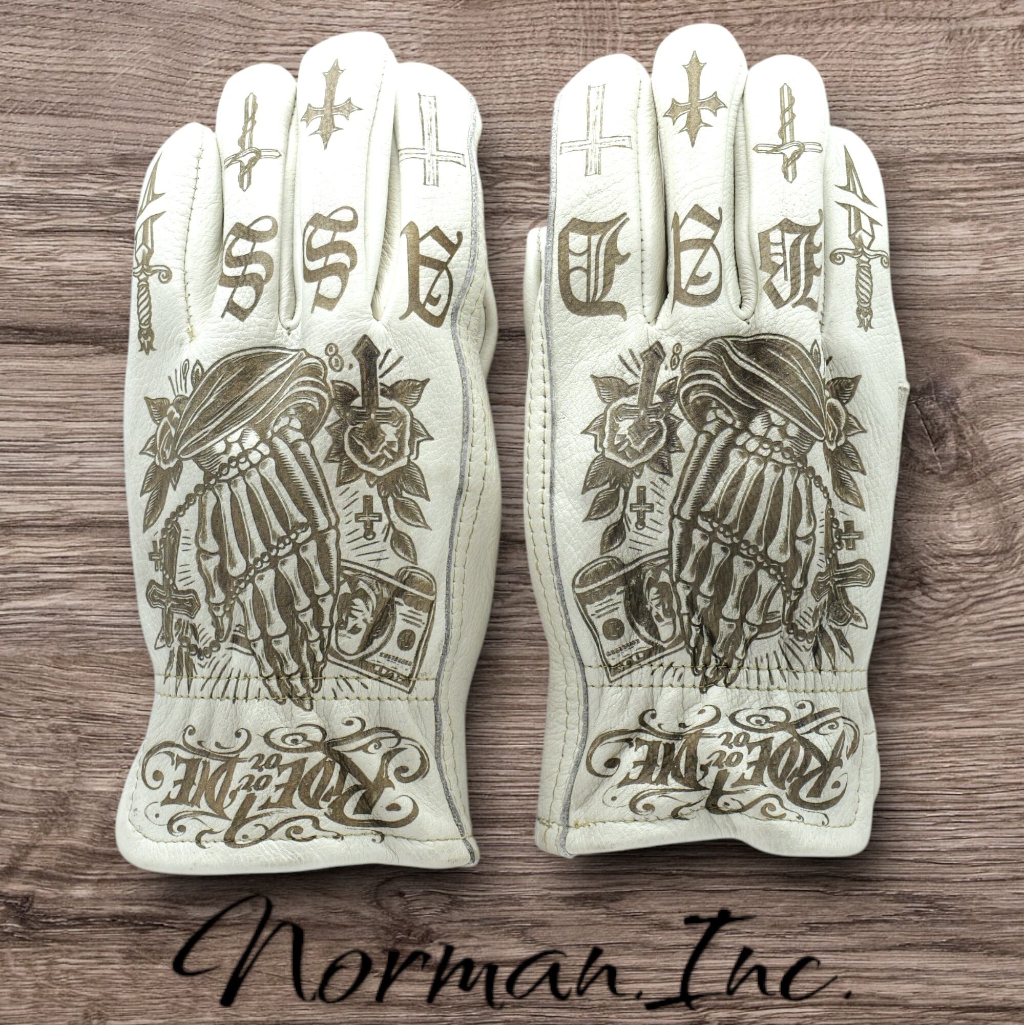 牛革 レザーグローブ ホワイト 白 アメリカン バイク ハーレー カスタム タトゥー 手袋 ツーリング  Lサイズ